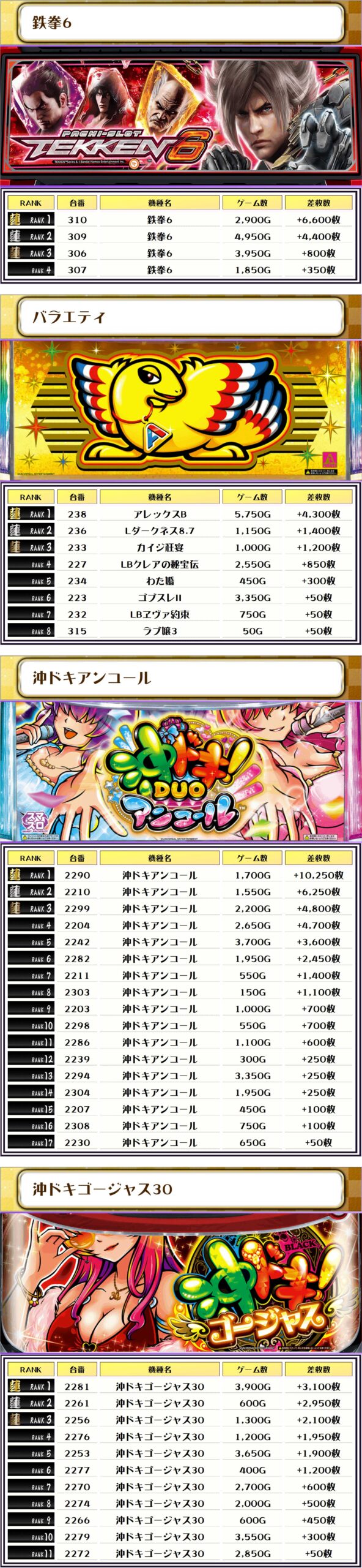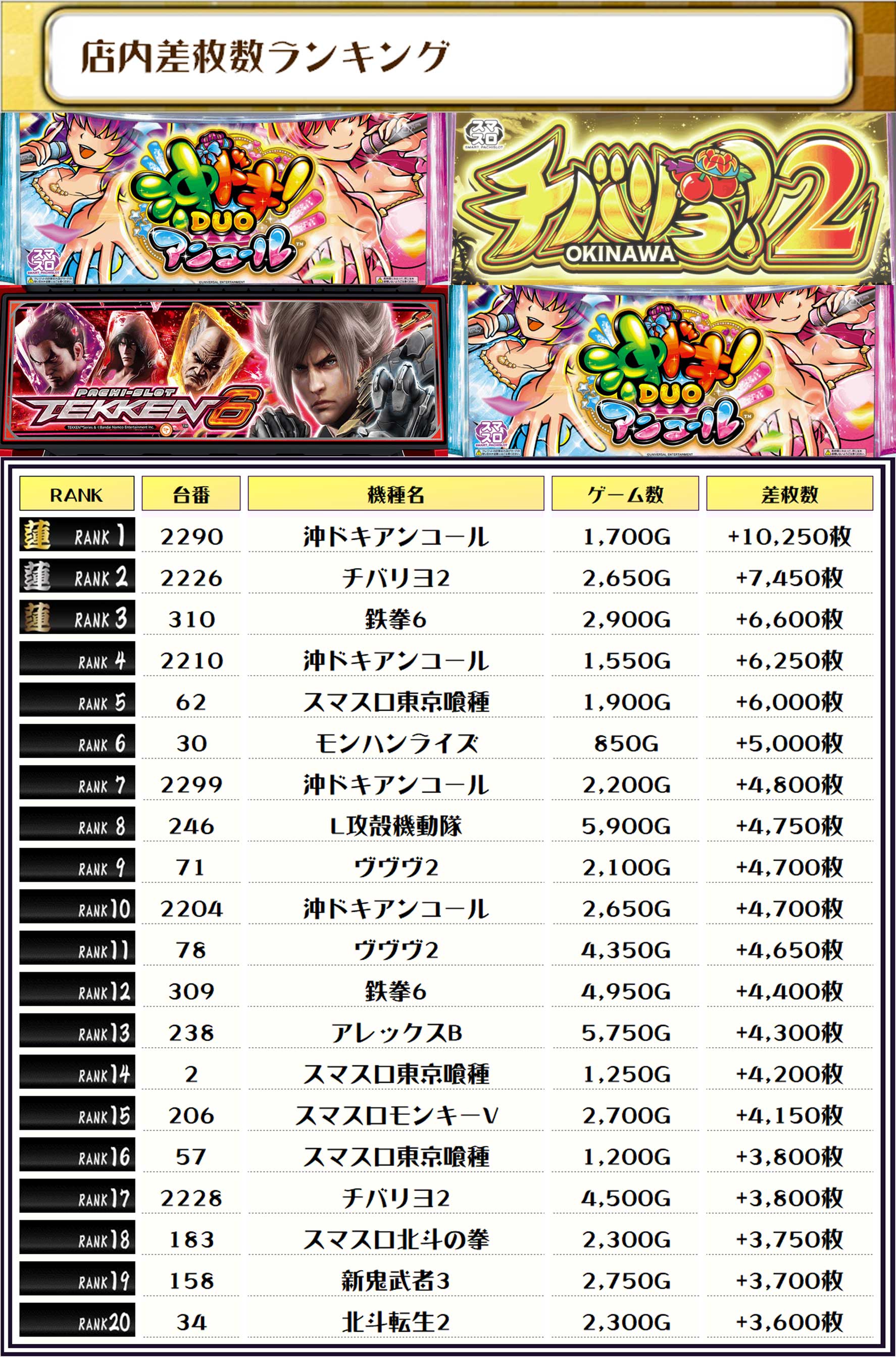 2位には【チバリヨ2・2226番台】の+7,450枚、そして3位には【鉄拳6・310番台】の+6,600枚がランクインしましたーっ🏆