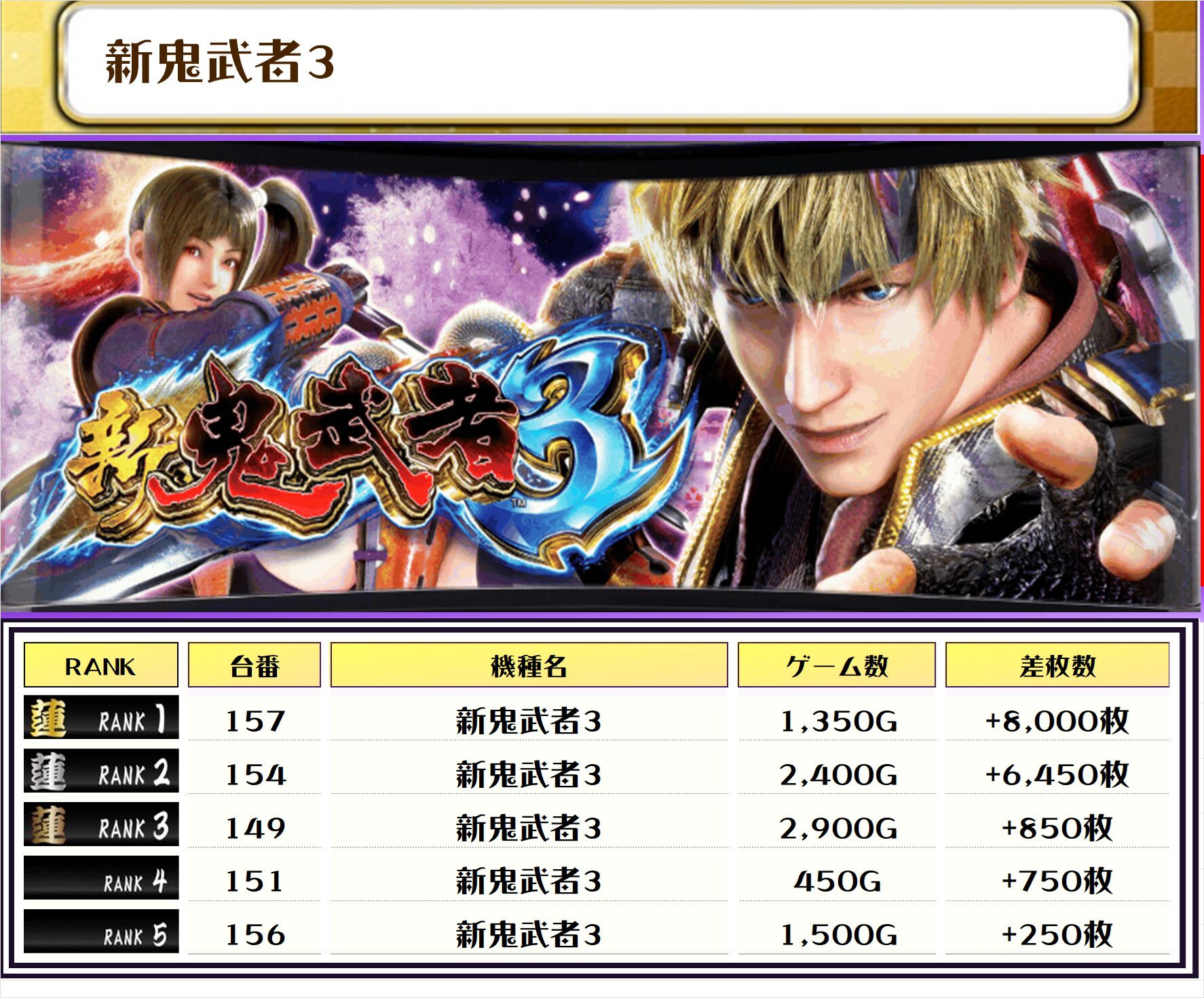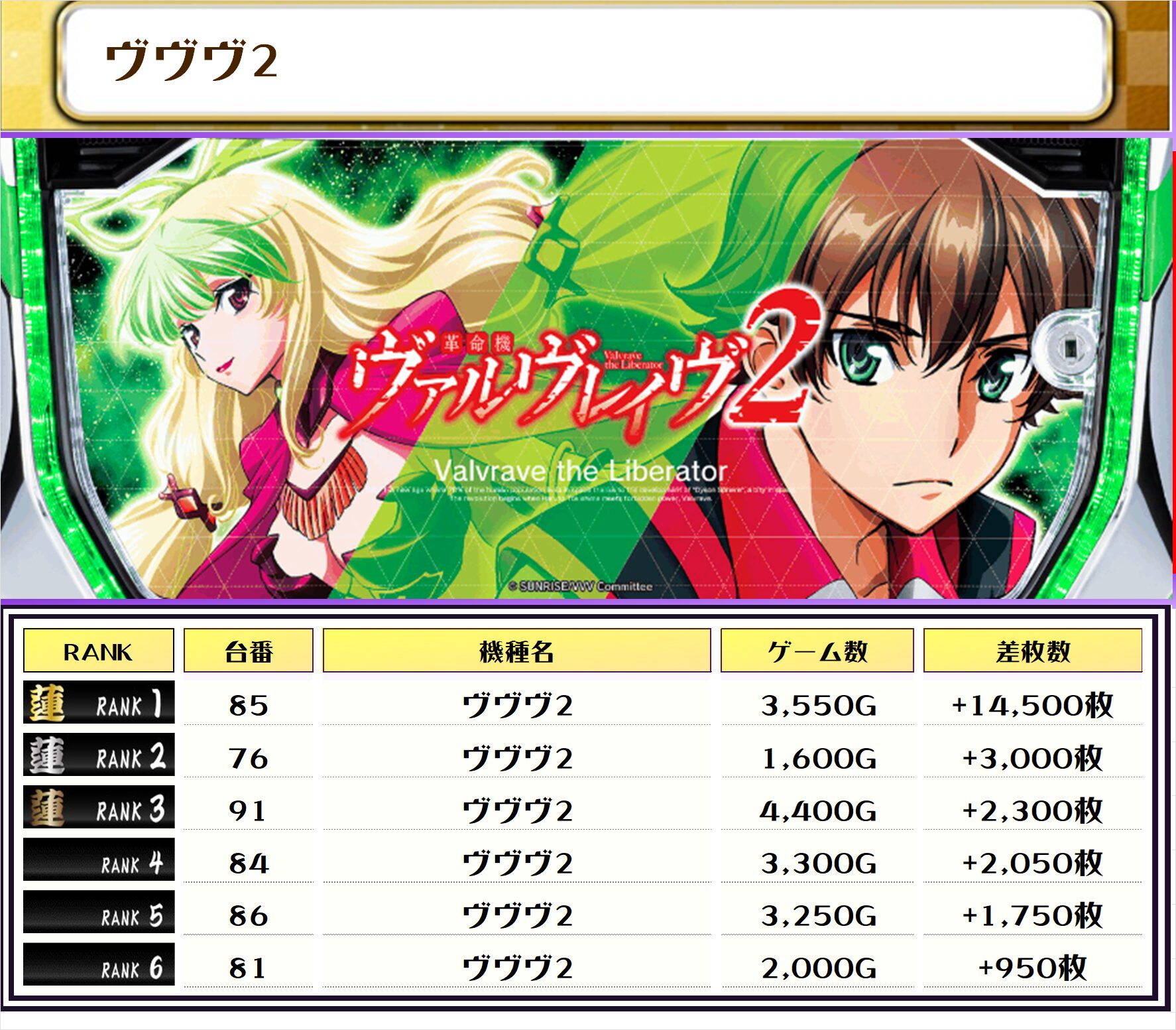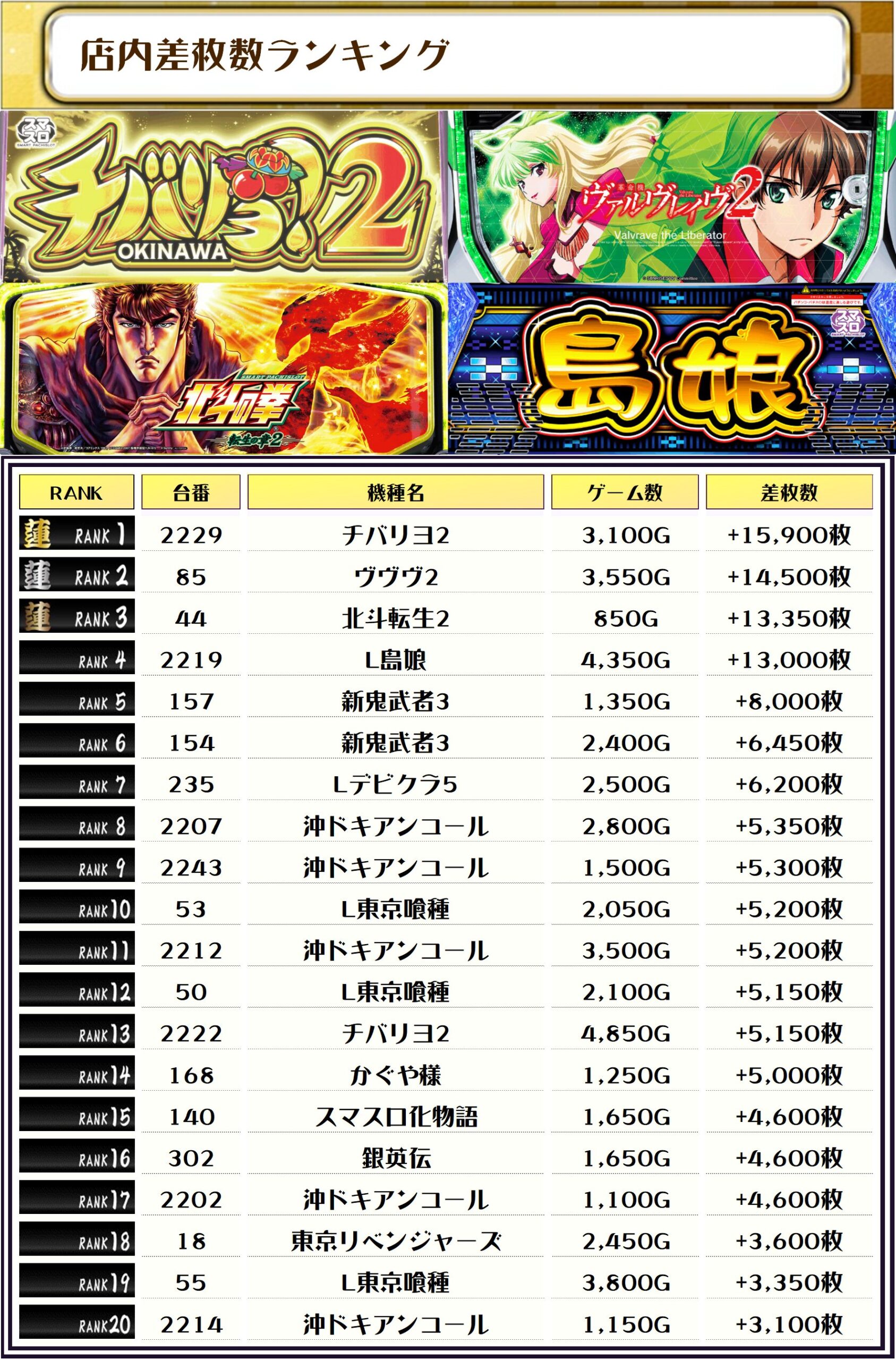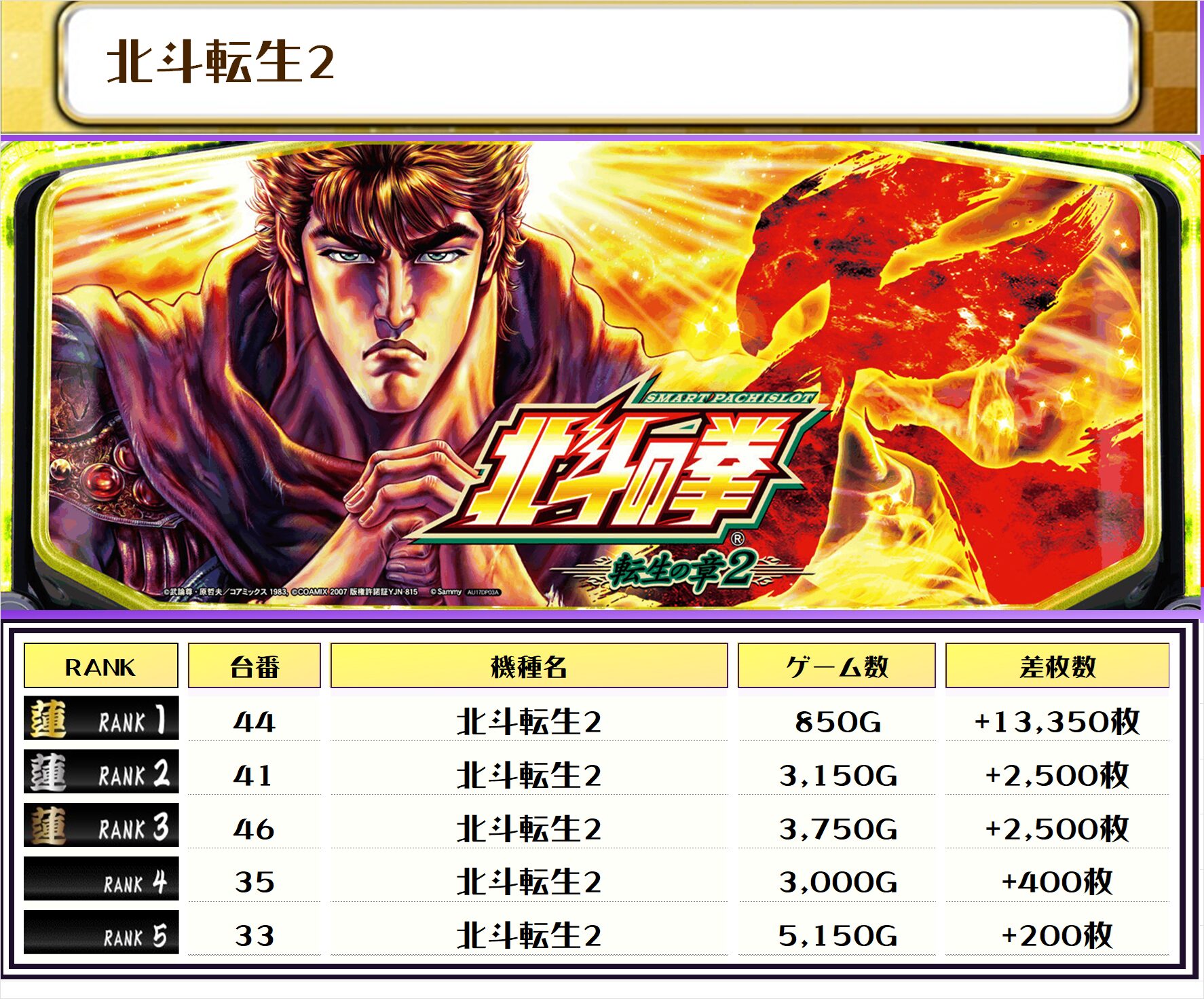 2位には【ヴヴヴ2・85番台】の+14,500枚、そして3位には【北斗転生2・44番台】の+13,350枚がランクインしましたーっ🏆