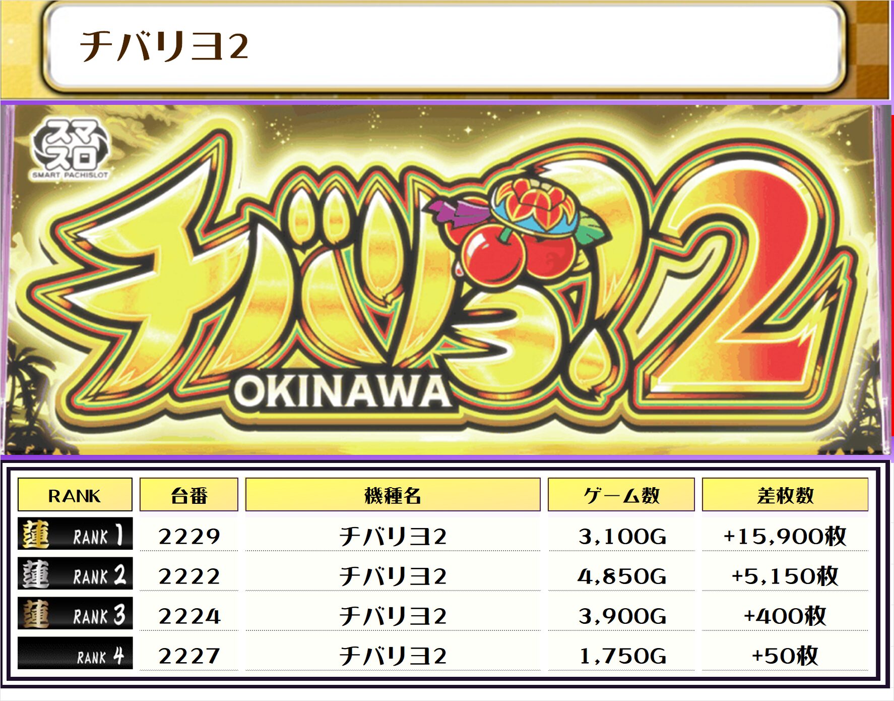 この日、差枚トップに輝いたのは【チバリヨ2・2229番台】で+15,900枚‼️