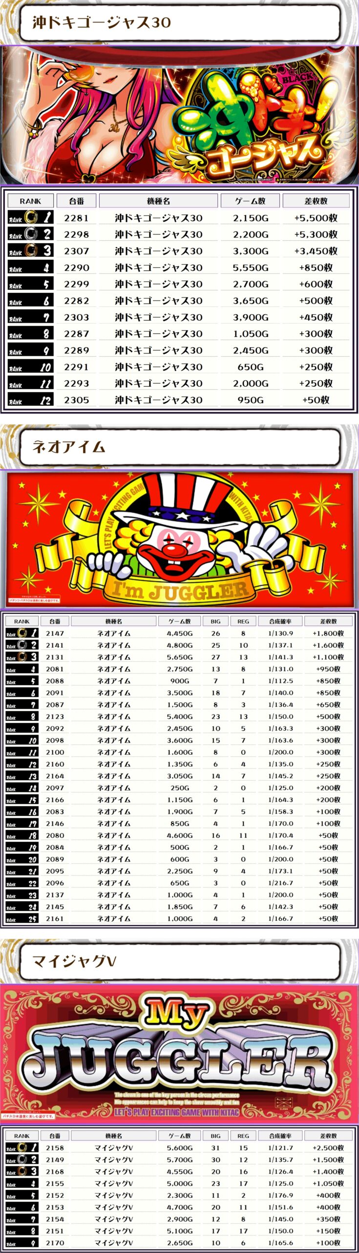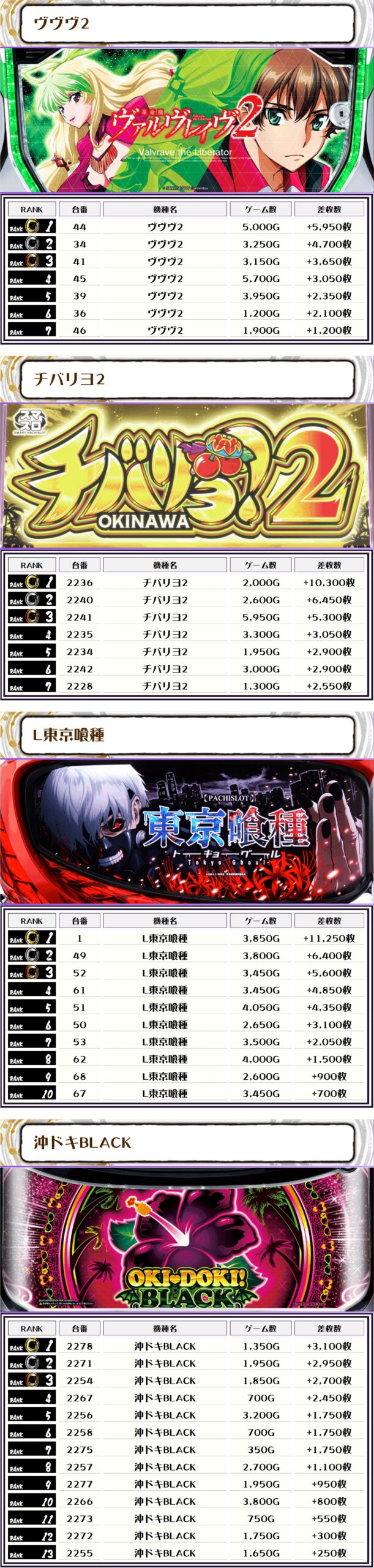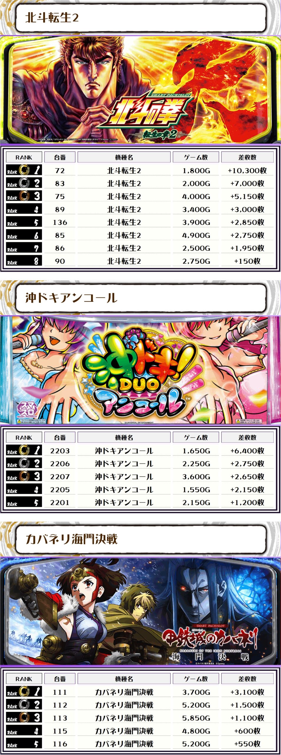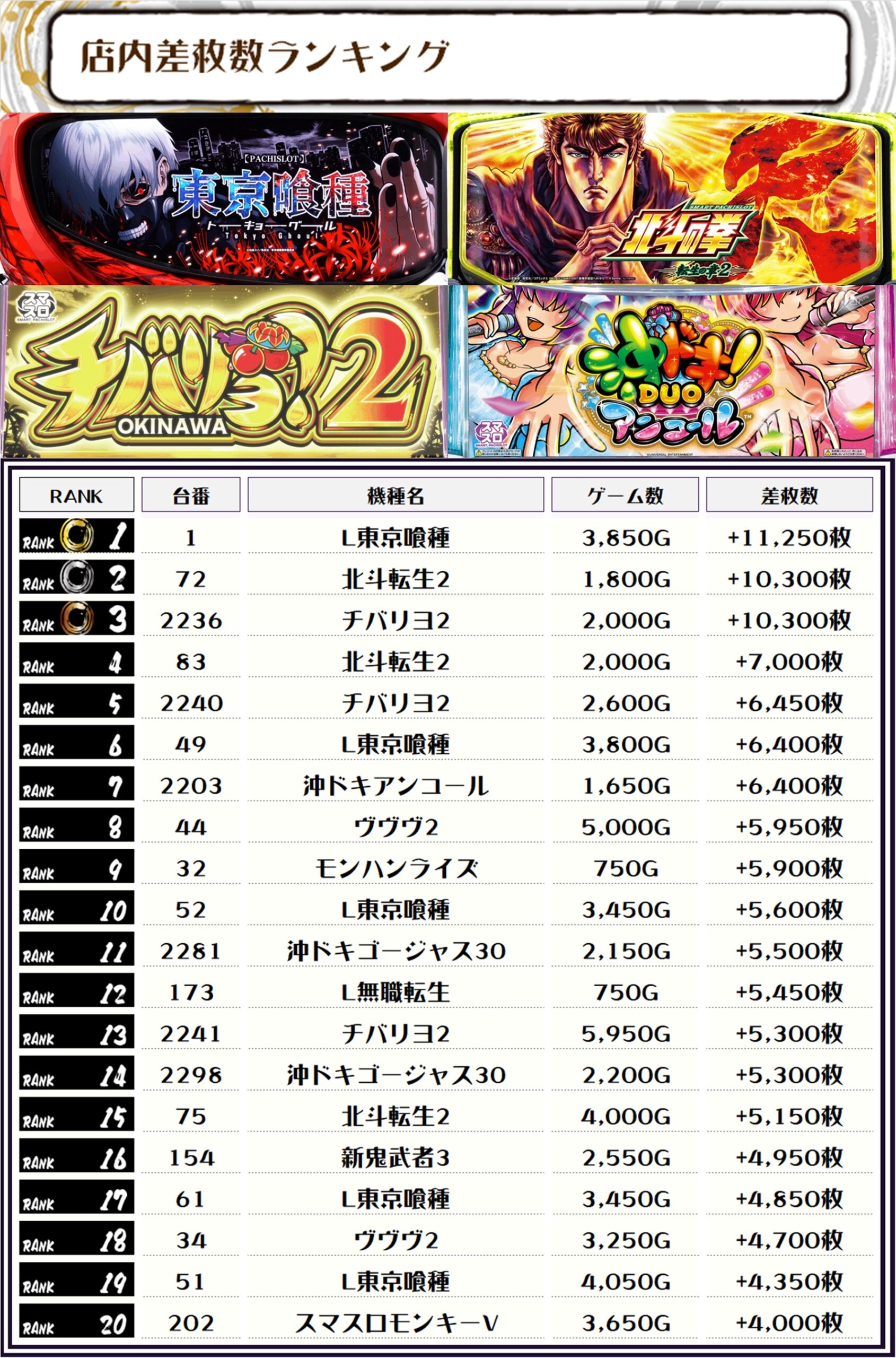 2位には【北斗転生2・72番台】の+10,300枚、そして3位には【チバリヨ2・2236番台】の+10,300枚がランクインっ🏆🏆🏆🏆