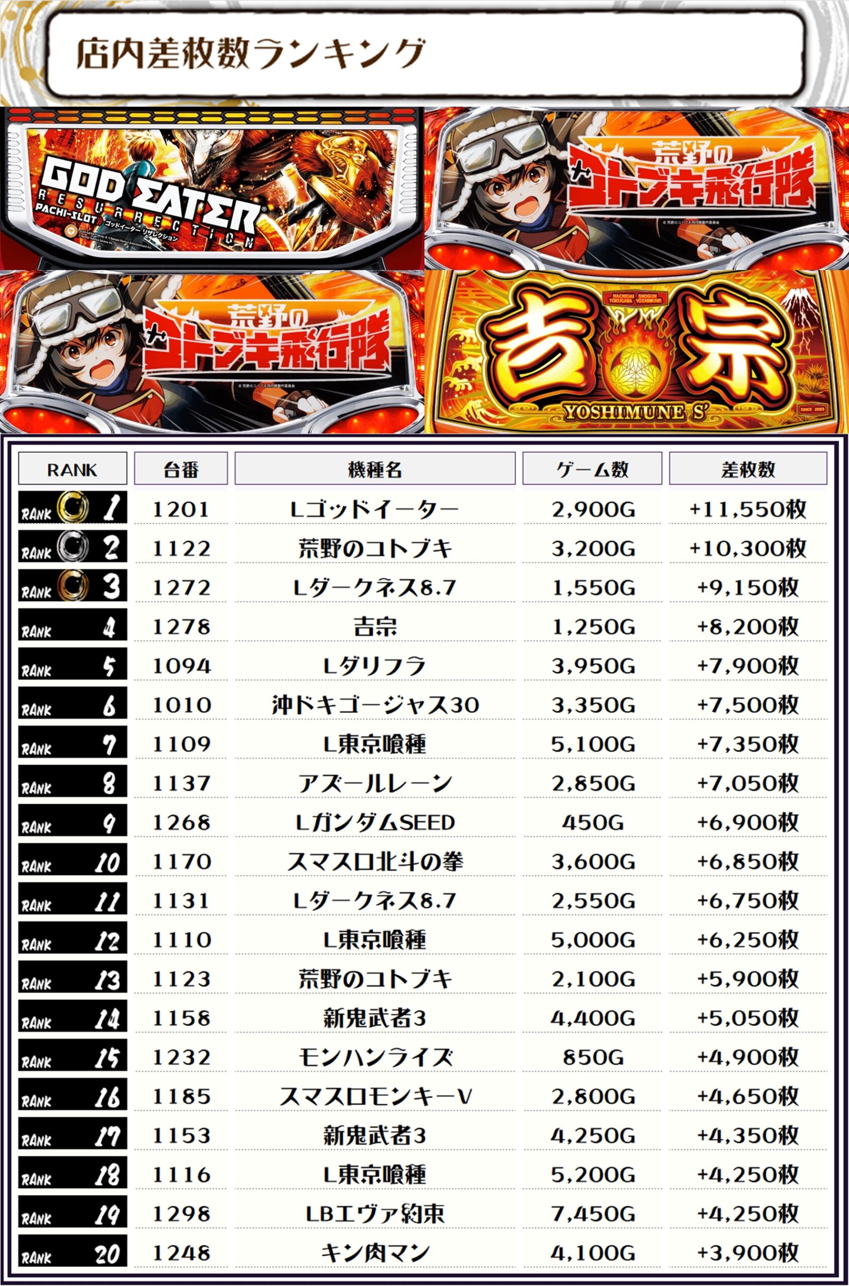 この日、全体の差枚トップに輝いたのは【Lゴットイーター・1201番台】で+11,550枚‼️