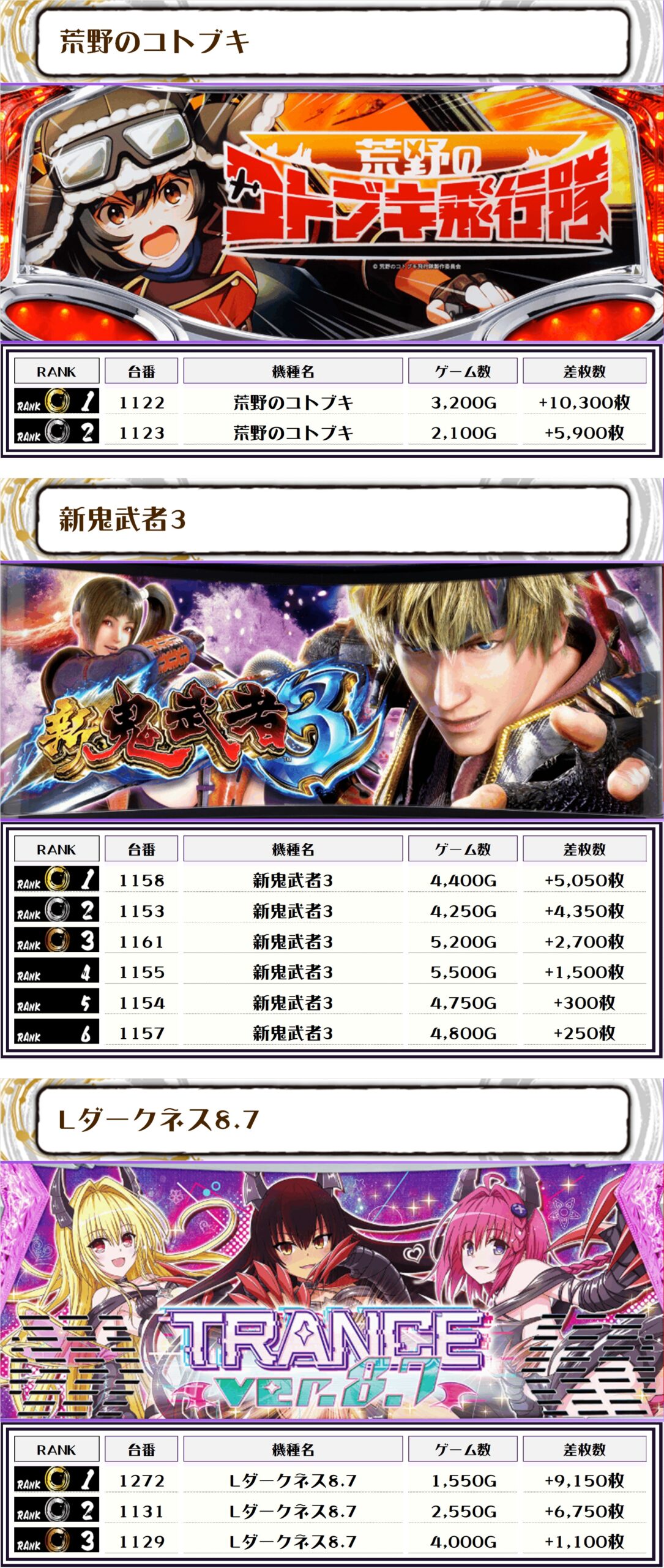 2位には【荒野のコトブキ・1122番台】の+10,300枚、そして3位には【Lダークネス8.7・1272番台】の+9,150枚がランクインっ🏆