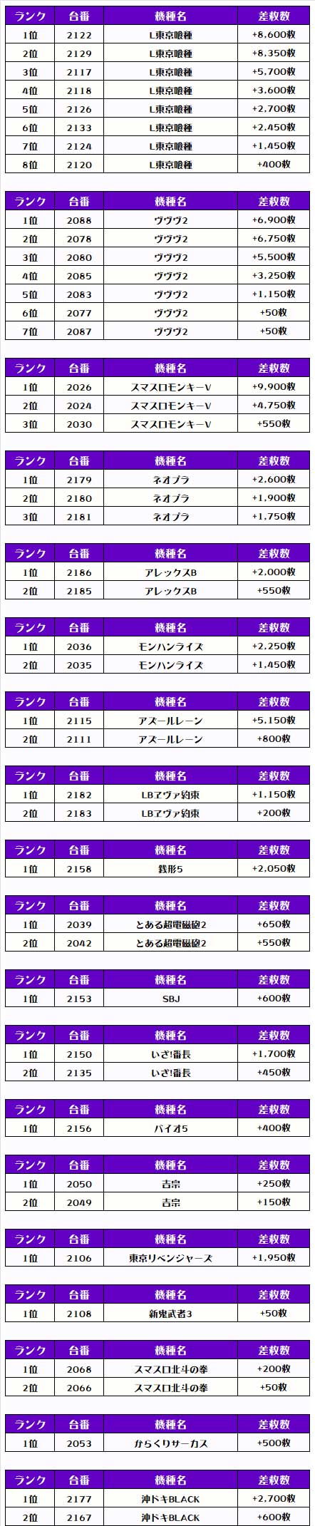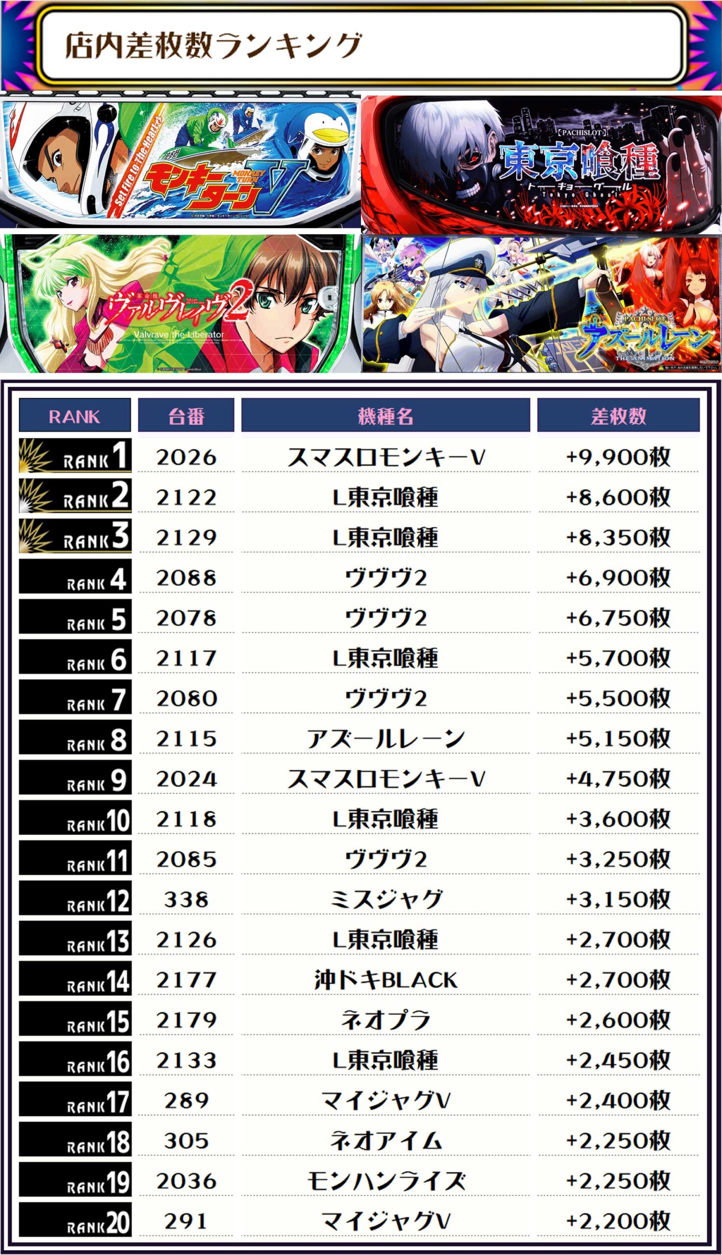2位には【L東京喰種・2122番台】の+8,600枚、そして3位にも同じく【L東京喰種・2129番台】の+8,350枚がランクインっ🏆🏆🏆