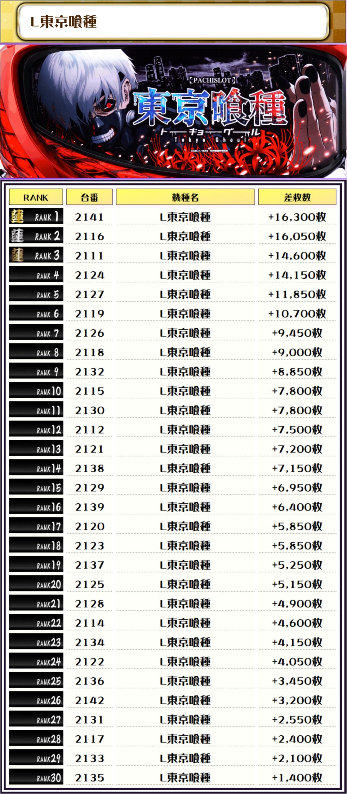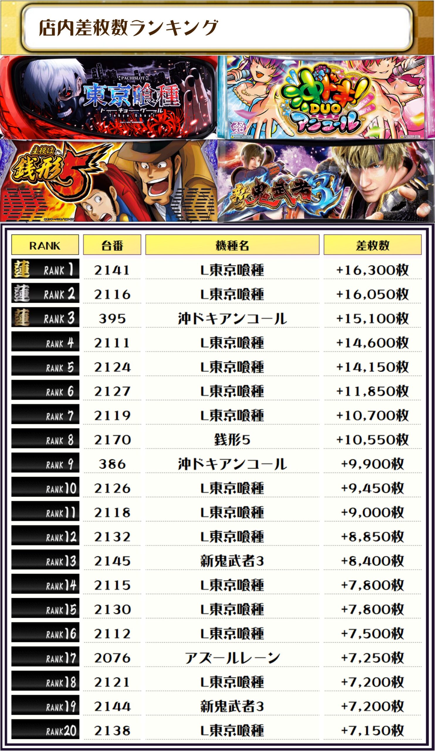 2位も【L東京喰種・2116番台】の+16,050枚、3位には【沖ドキアンコール・395番台】の+15,100枚がランクインっ🏆🏆🏆🏆