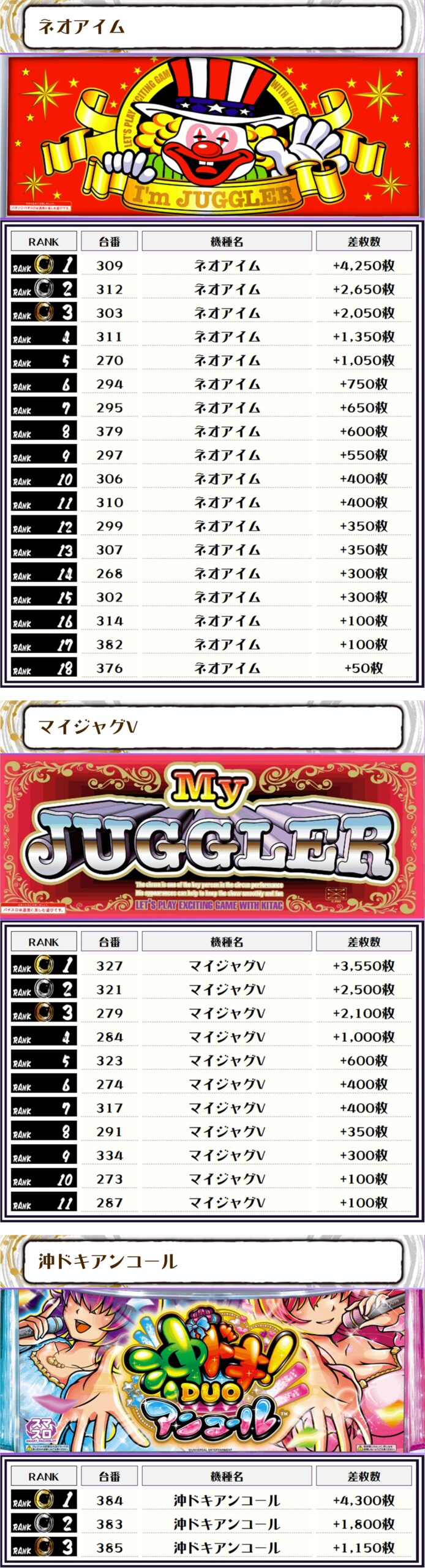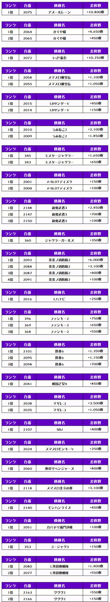また、この日の注目台差枚ランキングがこちら❗️