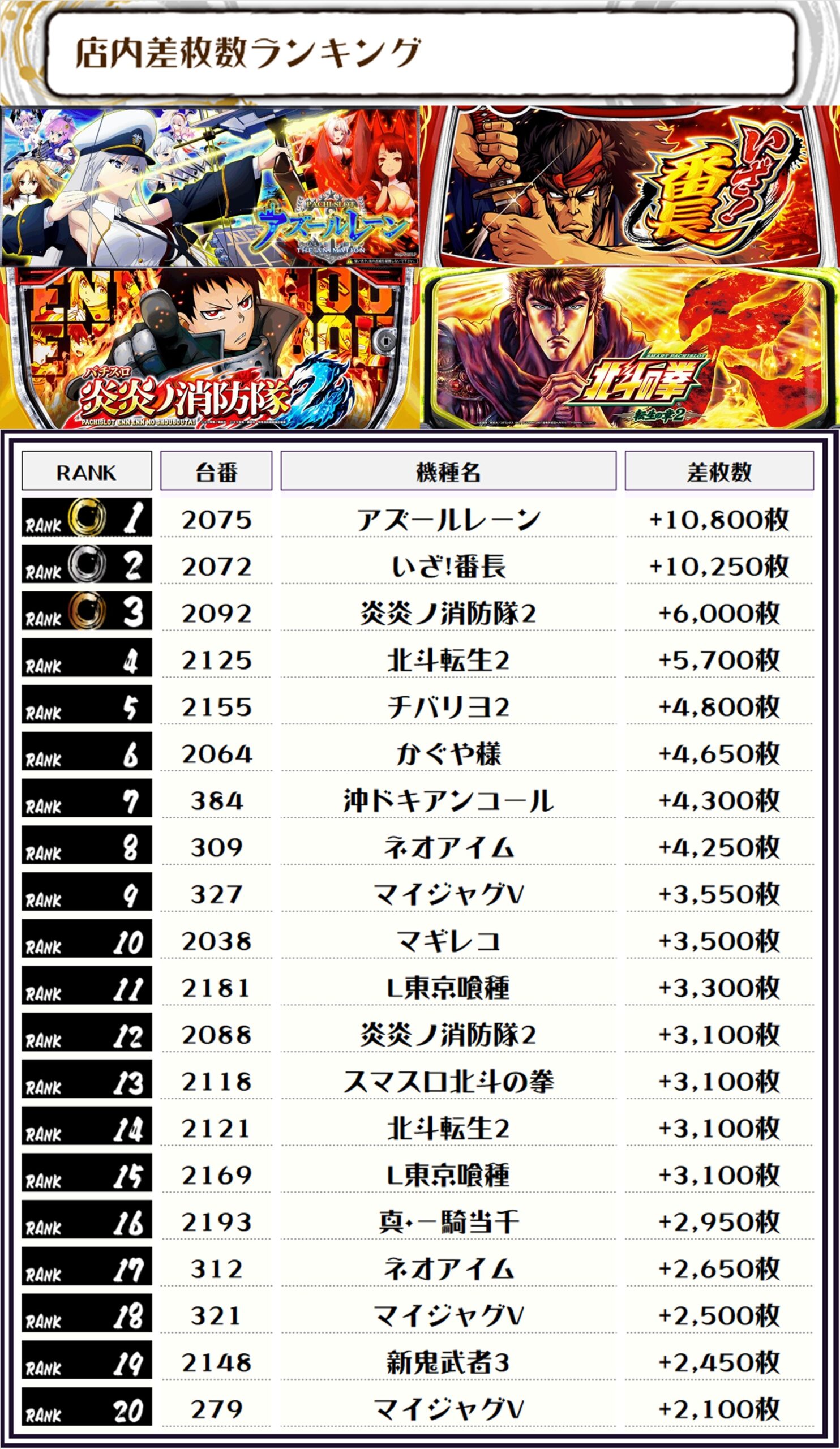 2位には【いざ!番長・2072番台】の+10,250枚、3位には【炎炎ノ消防隊2・2092番台】の+6,000枚がランクインっ🏆