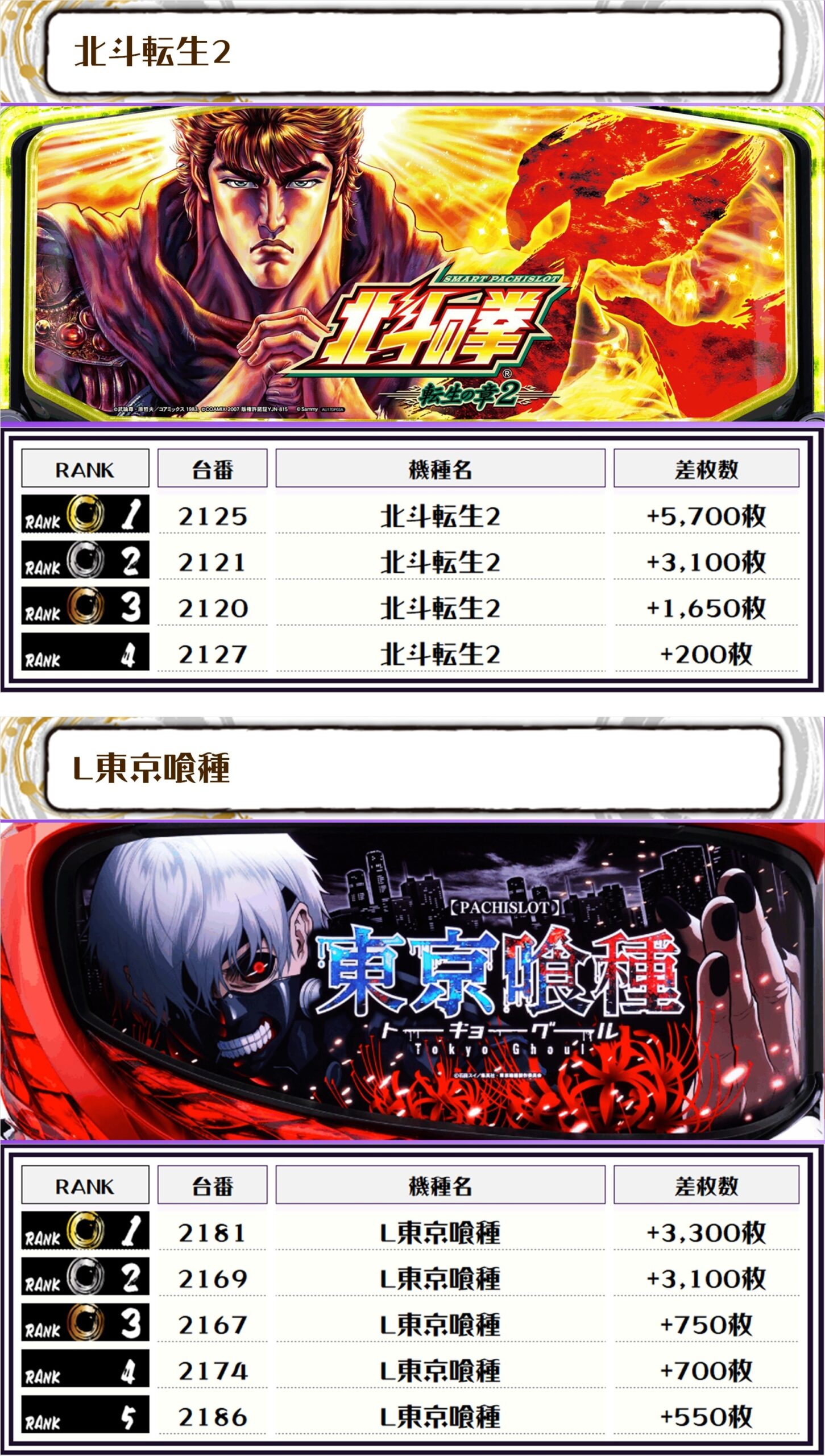 看板機種でもある北斗転生2・L東京喰種はさすがの活躍ですね✨