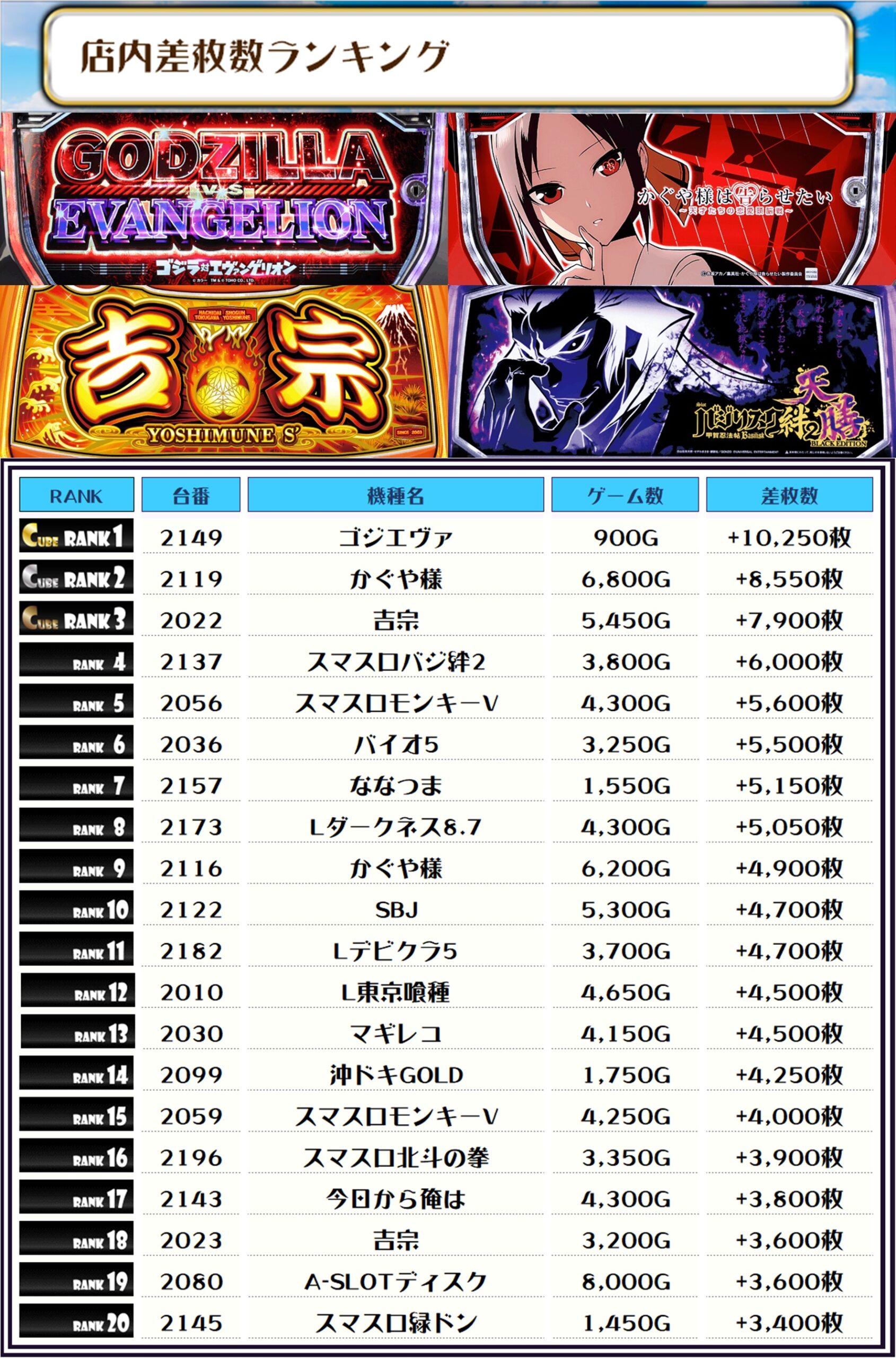最後に、この日の店内差枚ランキングとなります‼️