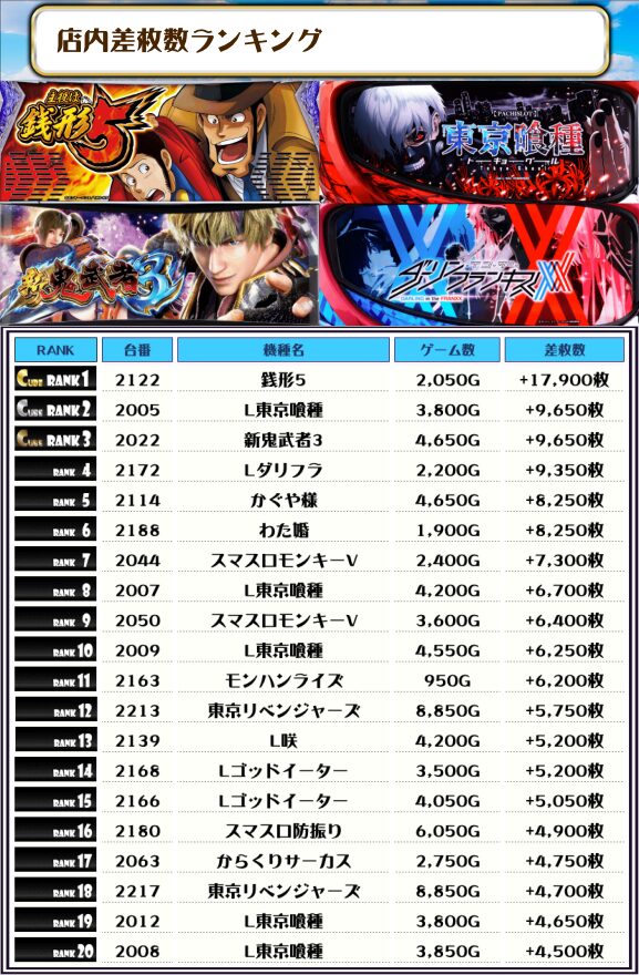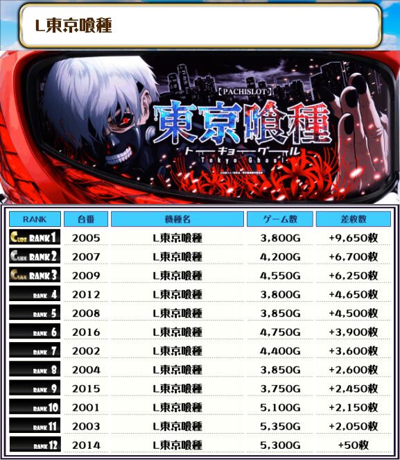 2位には【L東京喰種・2005番台】の+9,650枚、そして3位には【新鬼武者3・2022番台】の+9,300枚がランクインっ🏆🏆🏆