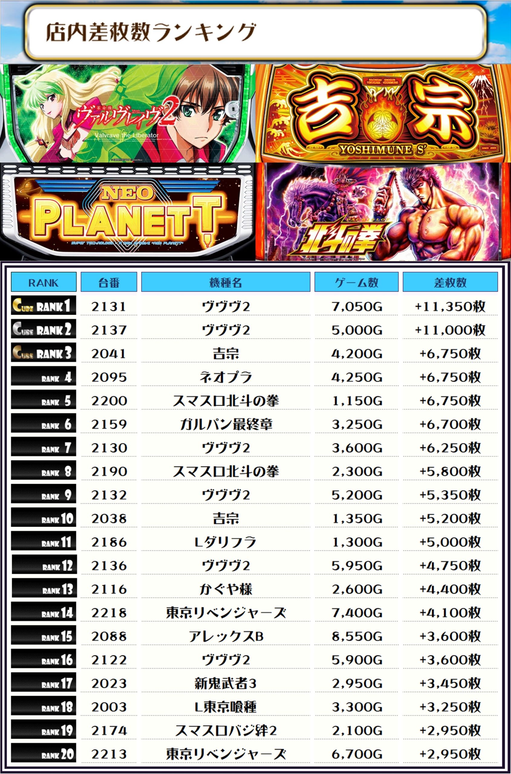 2位には【ヴヴヴ2・2137番台】の+11,000枚、3位には【吉宗・2041番台】の+6,750枚がランクインっ🏆🏆🏆