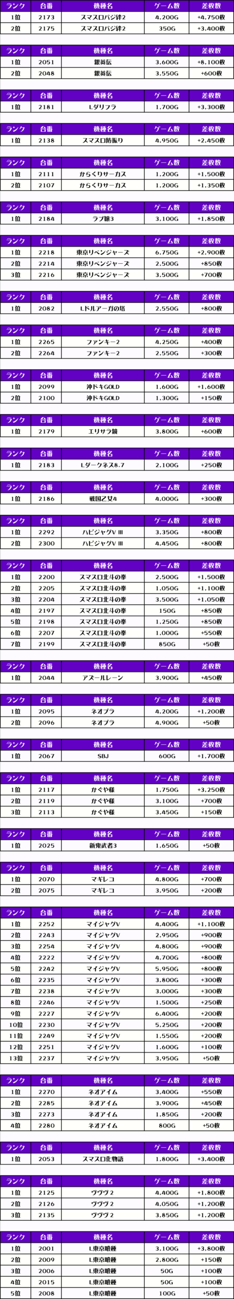 早速ですが機種別の差枚ランキングをどうぞ❗️