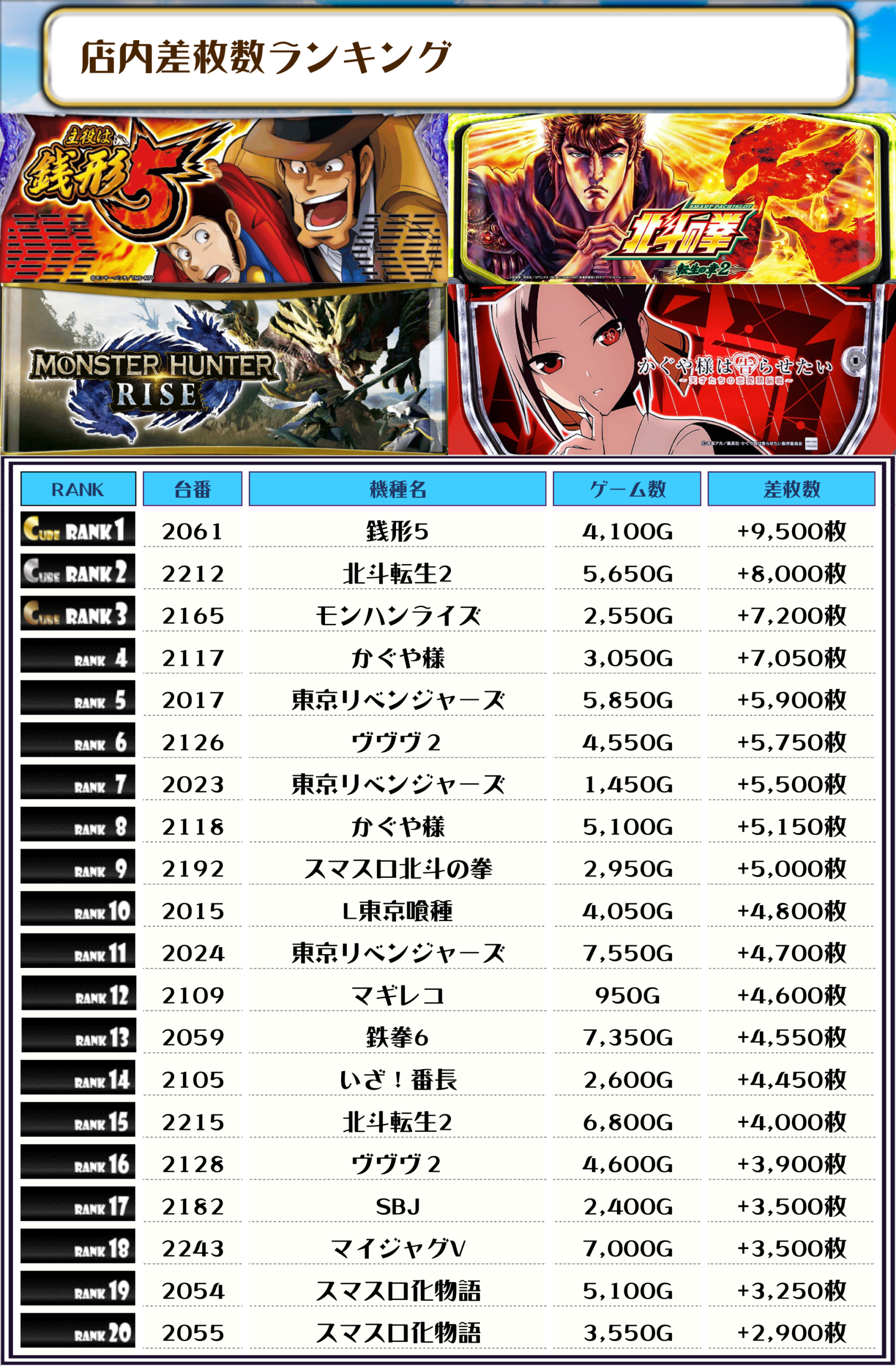 2位には【北斗転生2・2212番台】の+8,000枚、3位には【モンハンライズ・2165番台】の+7,200枚がランクインっ🏆🏆🏆