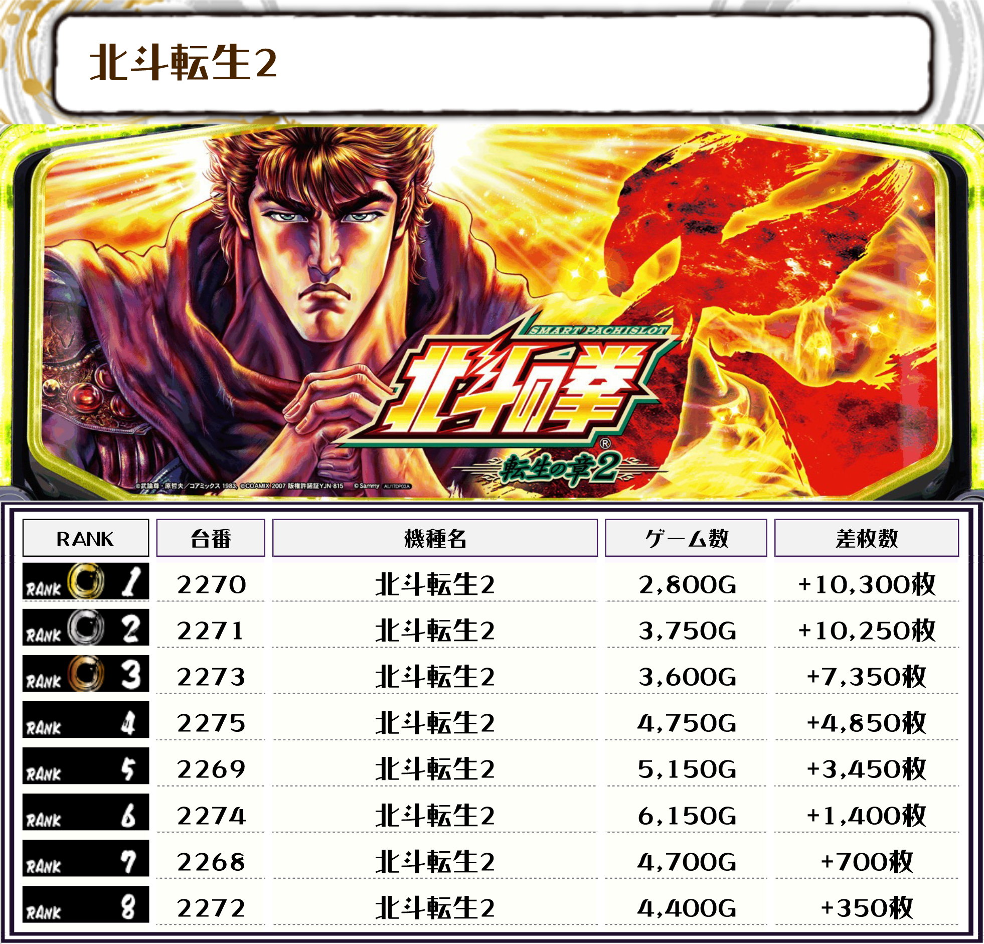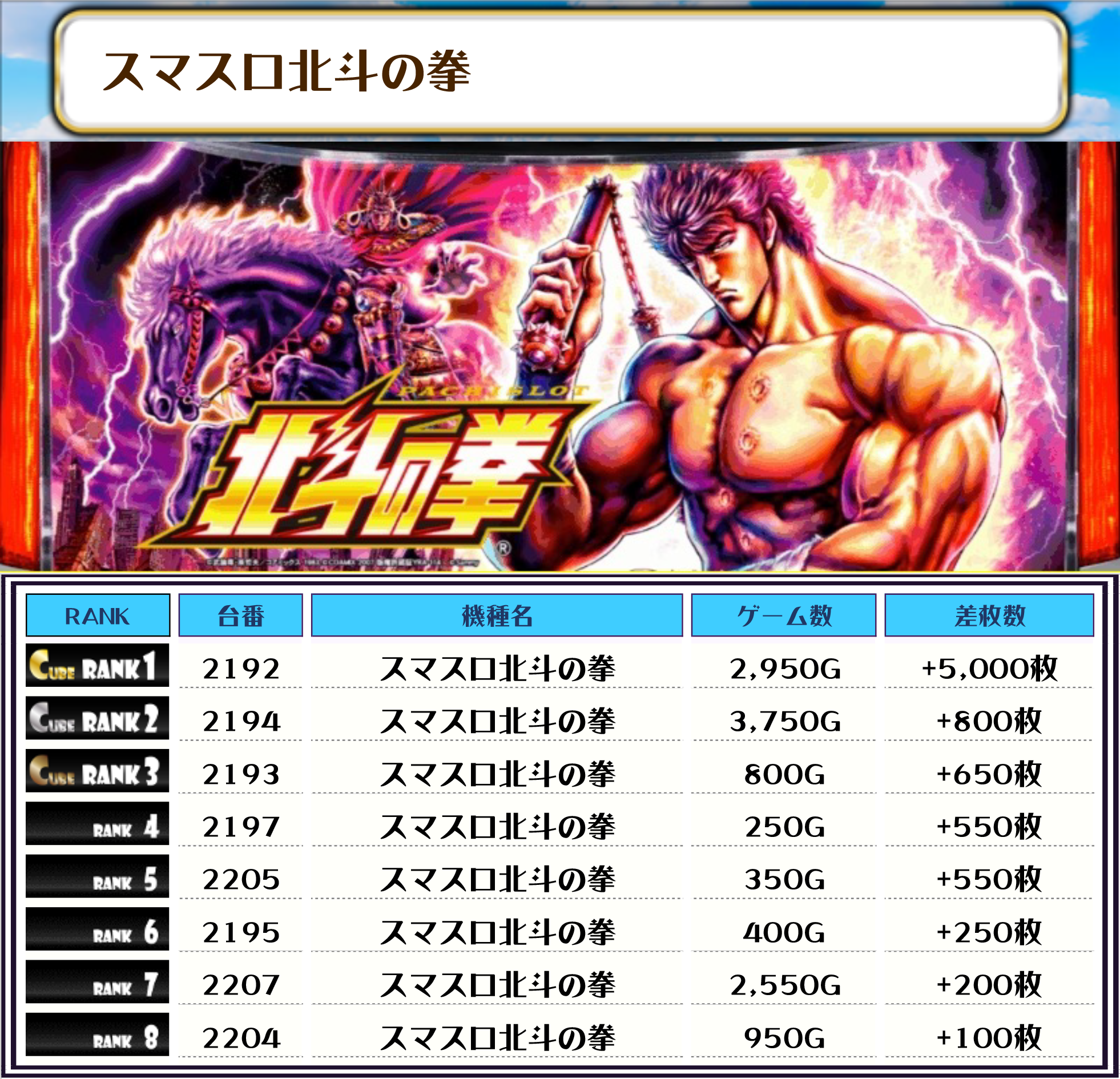新台の北斗転生2は言わずもがな、スマスロ北斗の拳も高稼働だったでやんすよっ😤北斗転生2は2位にもランクインしておりやすっ👏👏