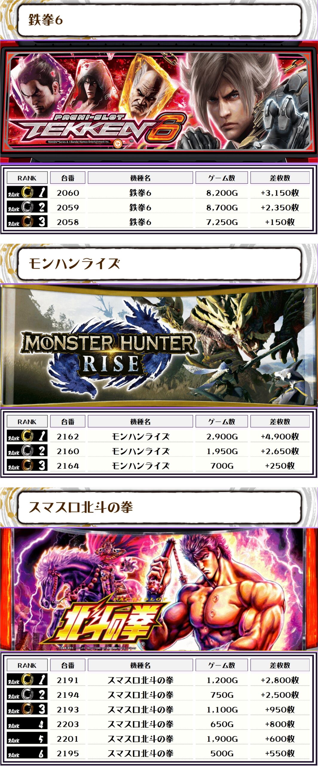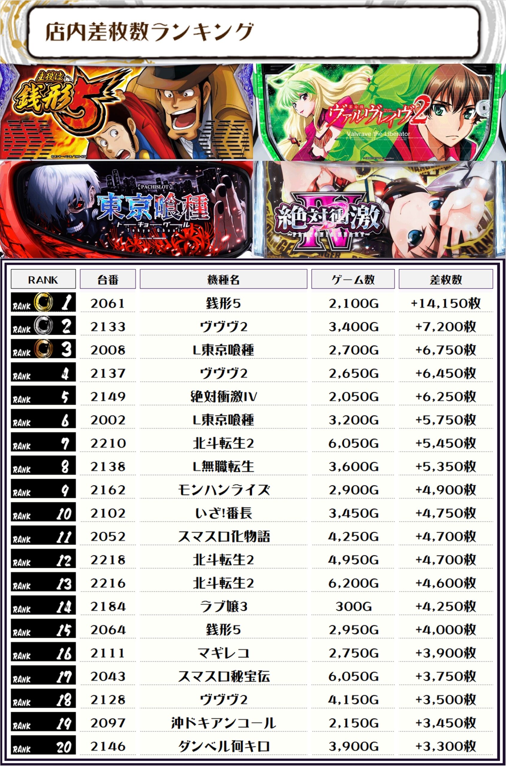 2位には【ヴヴヴ2・2133番台】の+7,200枚、3位には【L東京喰種・2008番台】の+6,750枚がランクインっ🏆