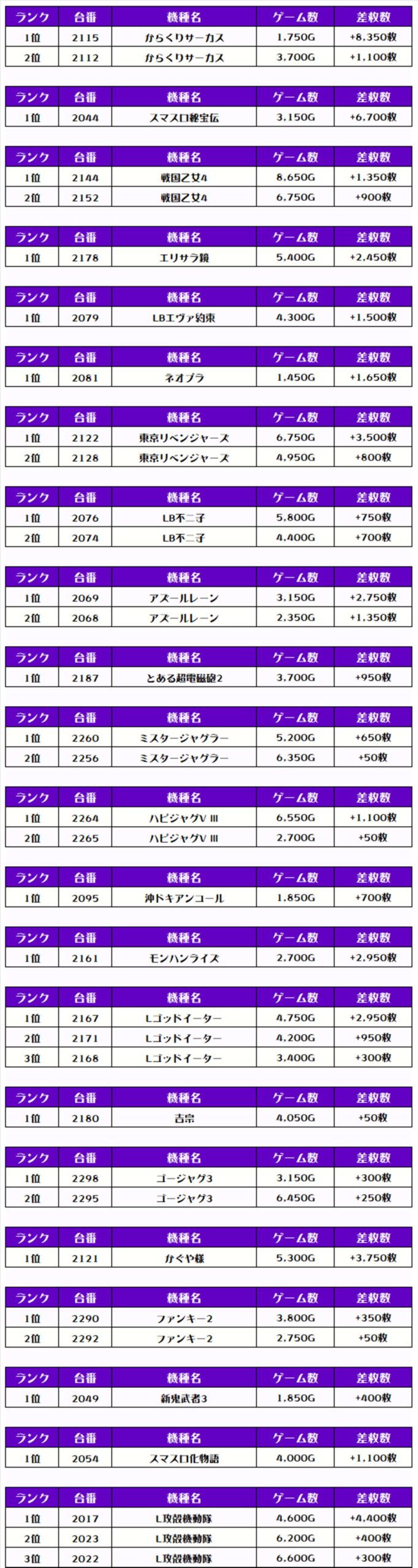 2位には【からくりサーカス・2115番台】の+8,350枚、そして3位には【スマスロ秘宝伝・2044番台】の+6,700枚がランクインっ🏆🏆🏆