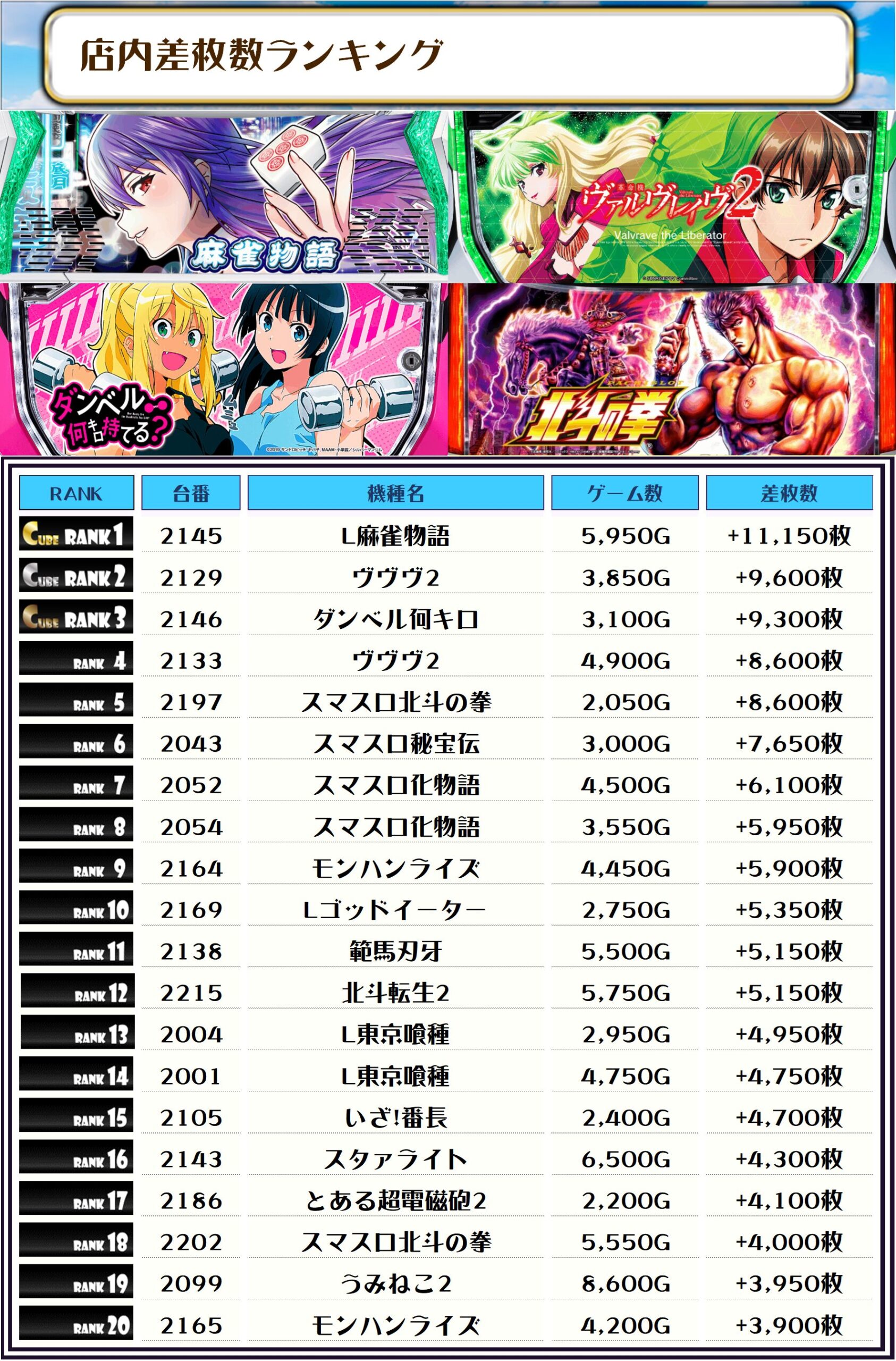 早速ですが機種別の差枚ランキングをどうぞ❗️