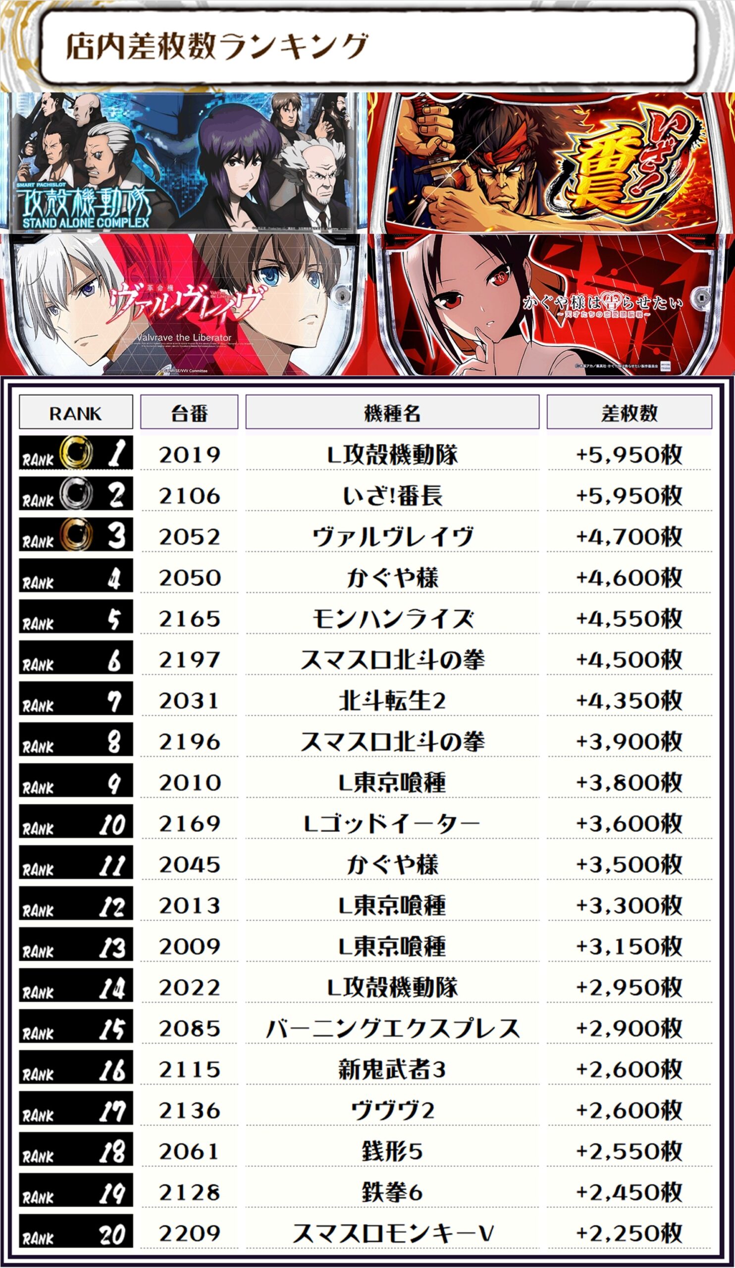 2位には【いざ!番長・2106番台】の+5,950枚、3位には【ヴァルヴレイヴ・2052番台】の+4,700枚がランクインっ🏆