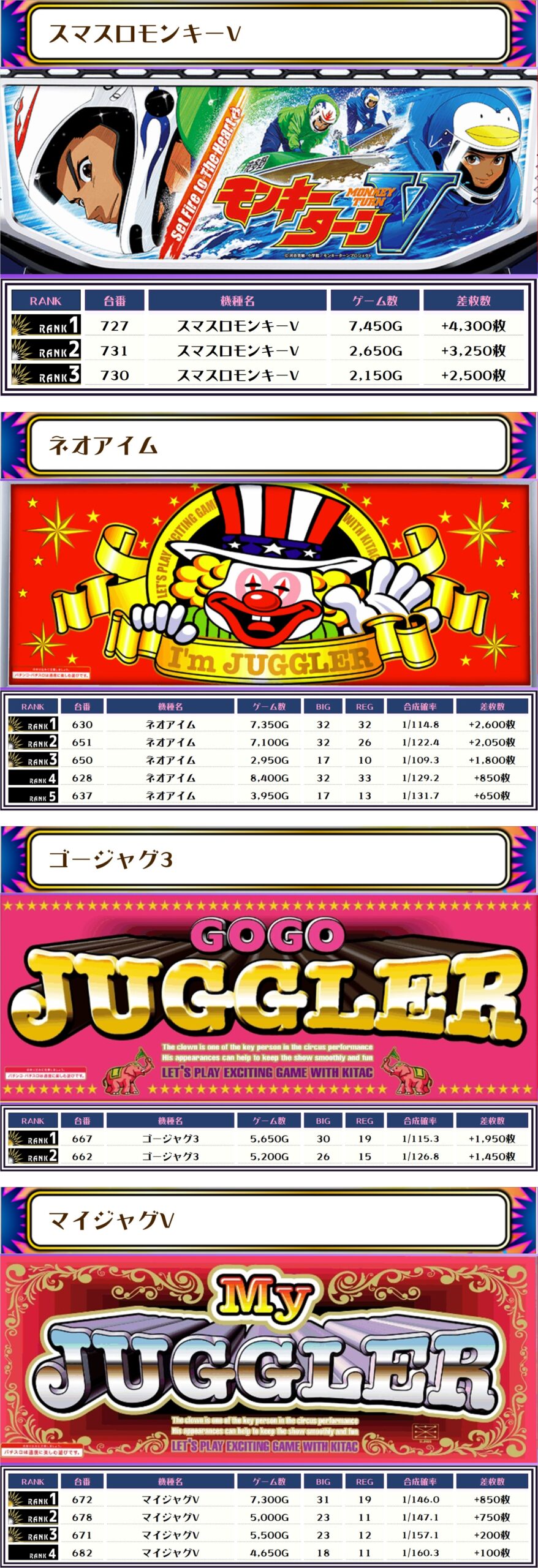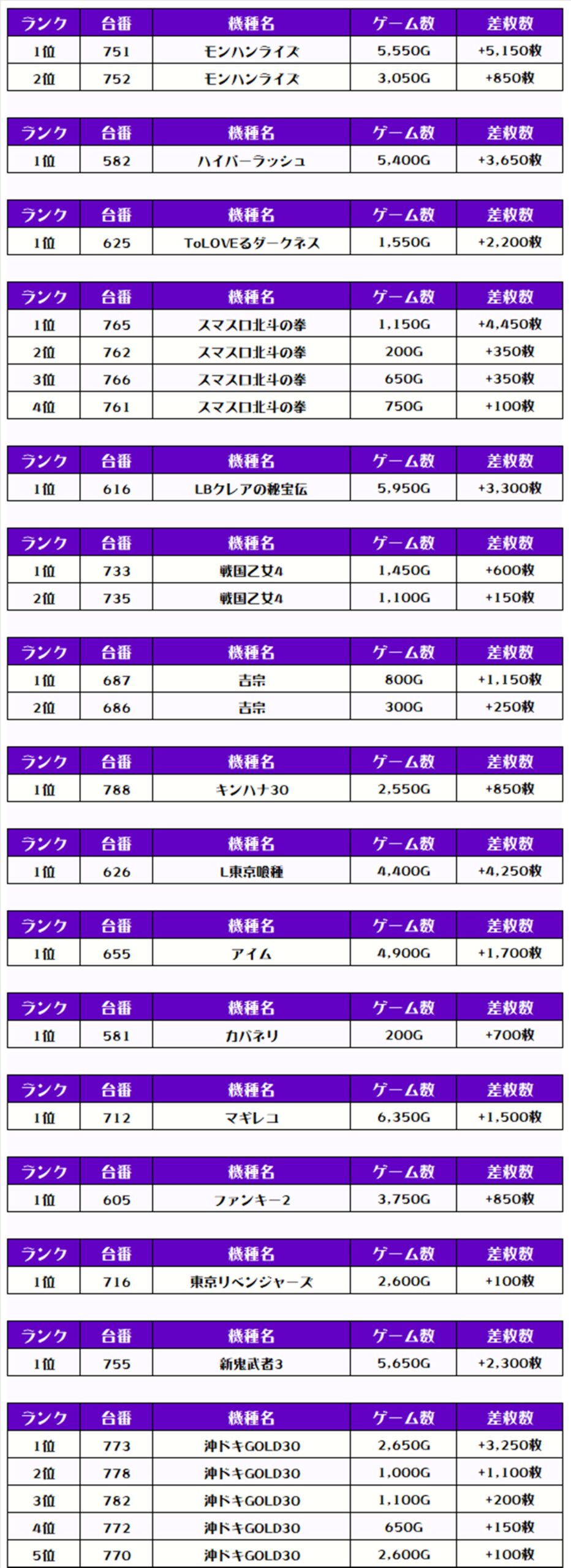 それでは、この日の【機種別差枚ランキング】を見ていきましょう❗️