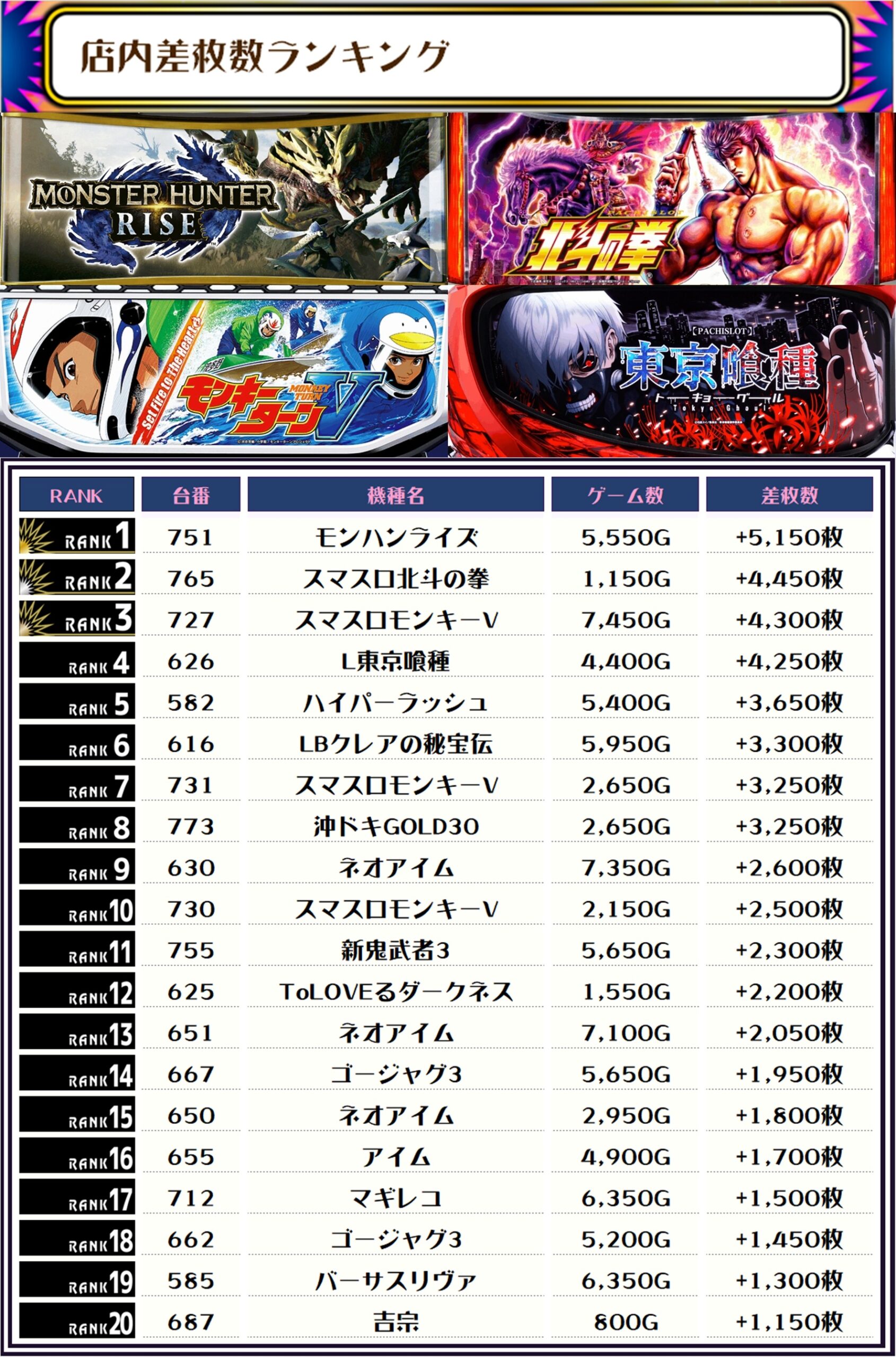 そして、この日全台を対象とした差枚ランキングがこちらになりますっ👍