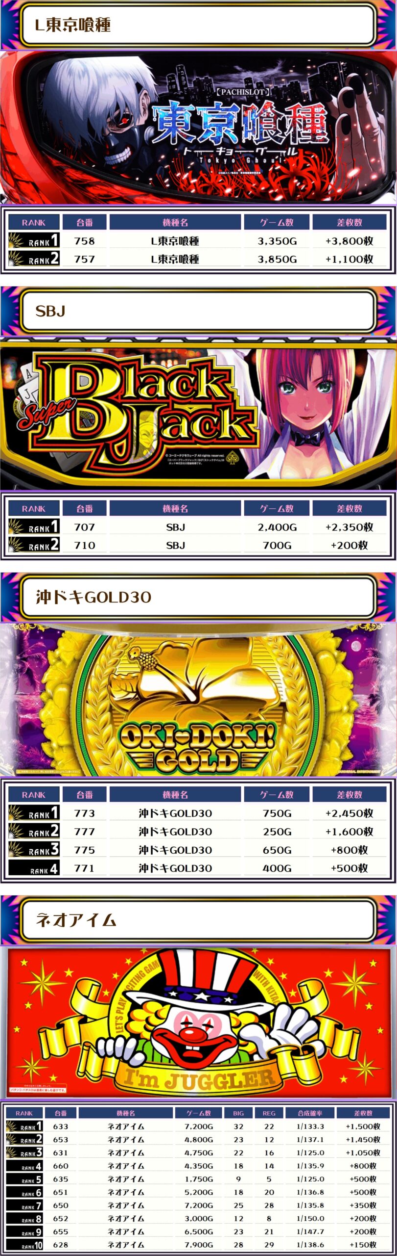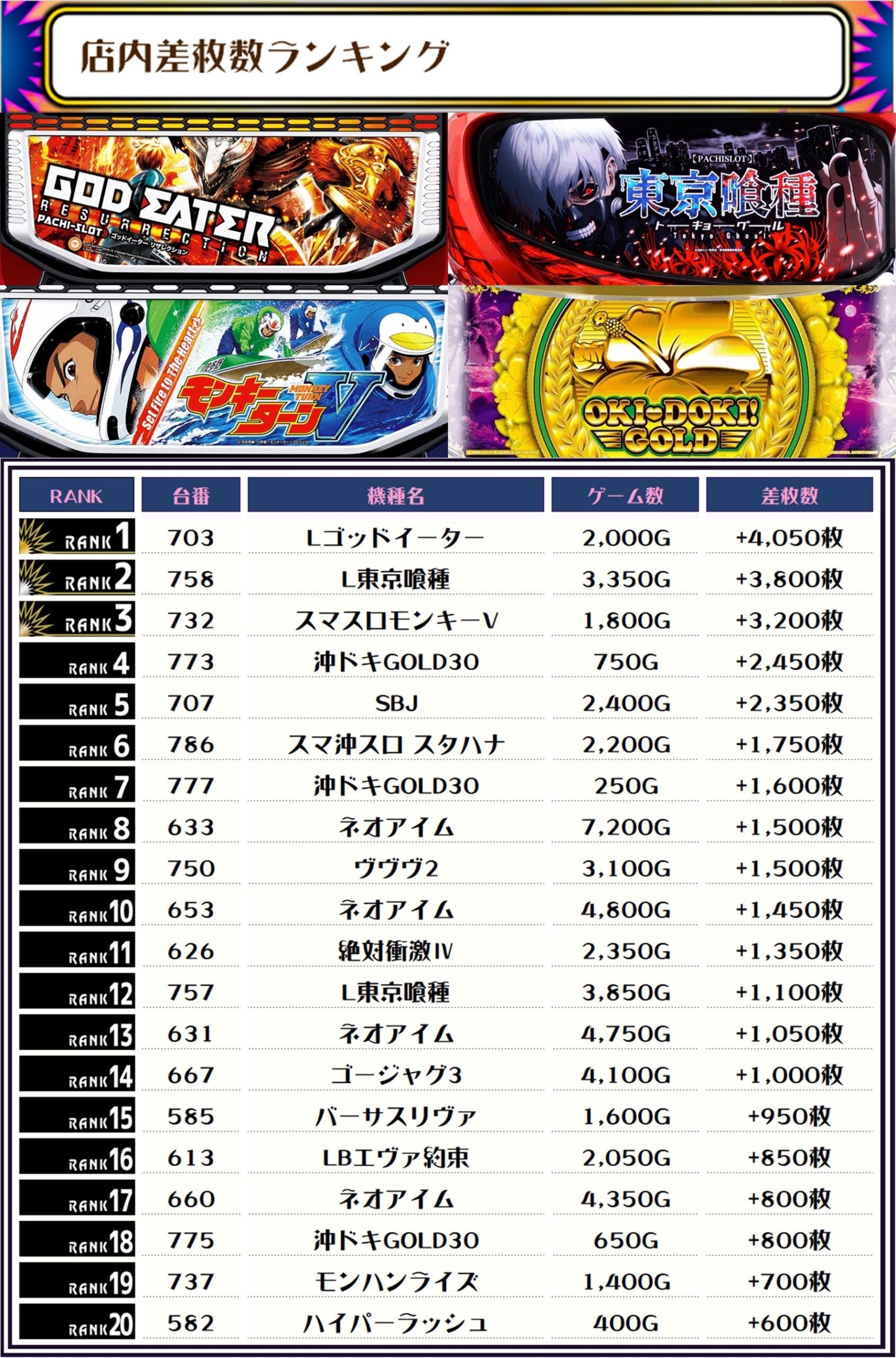 そして2位には【L東京喰種・758番台】の+3,800枚、3位には【スマスロモンキーV・732番台】の+3,200枚がランクインっ🏆🏆🏆🏆