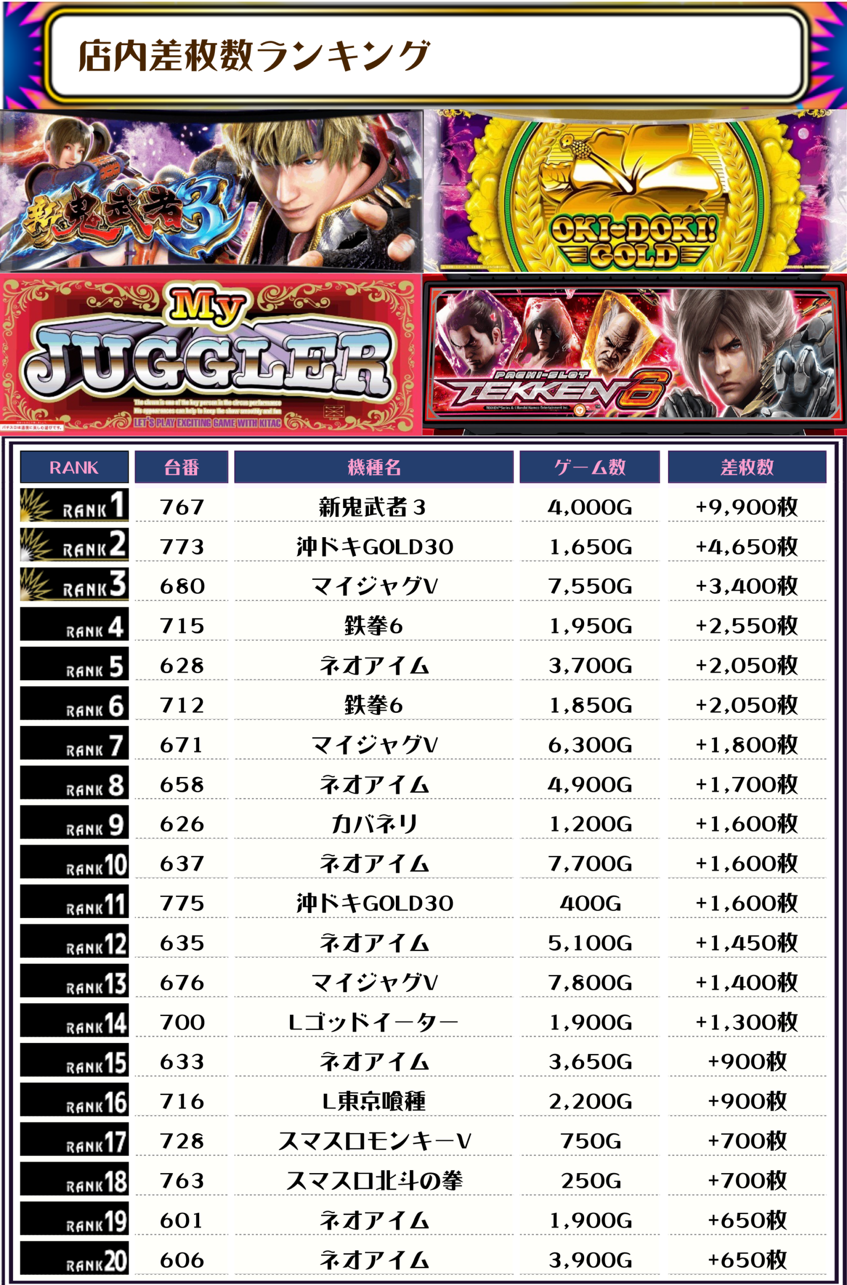 そして2位には【沖ドキGOLD30・773番台】の+4,650枚、3位には【マイジャグV・680番台】の+3,400枚がランクインっ🏆🏆🏆🏆