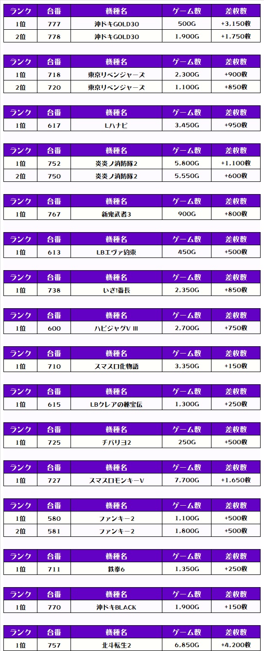 そして2位には【ネオアイム・605番台】の+3,250枚、3位には【冲ドキGOLD30・777番台】の+3,150枚がランクインっ🏆🏆🏆🏆