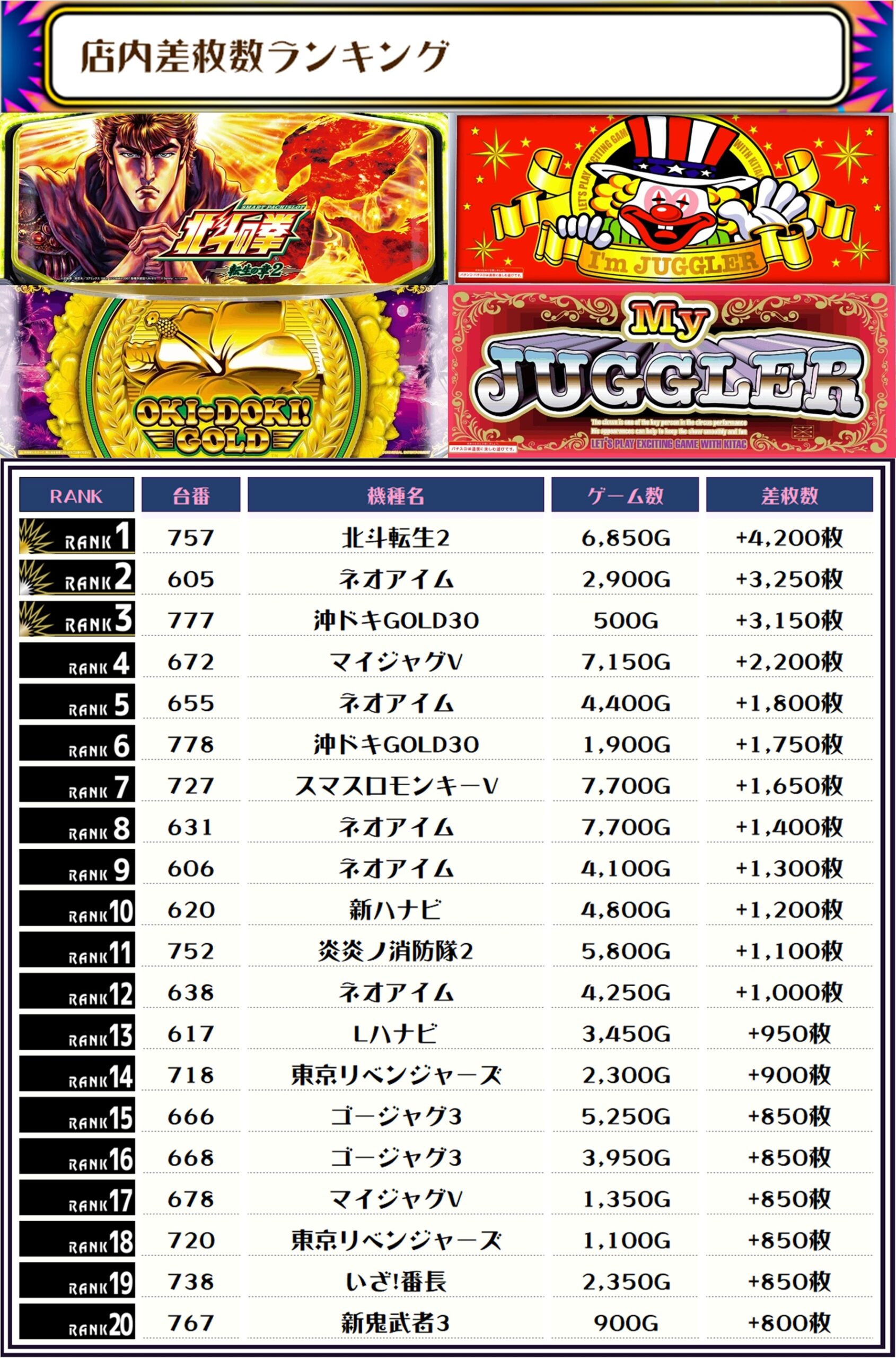 そして、この日全台を対象とした差枚ランキングがこちらになりますっ👍