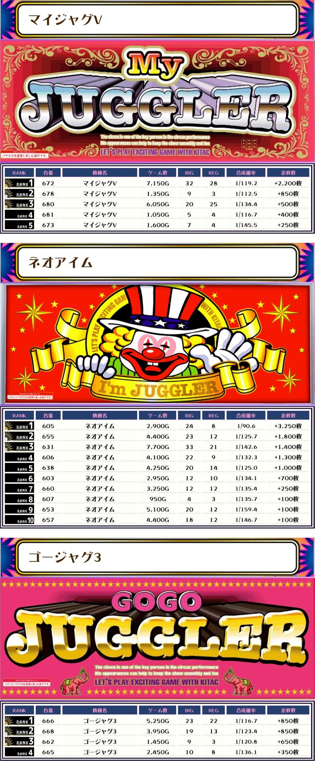 ジャグ系の中ではネオアイム・マイジャグV・ゴージャグ3が特に稼働が高く優秀台が多く見られましたよ👌