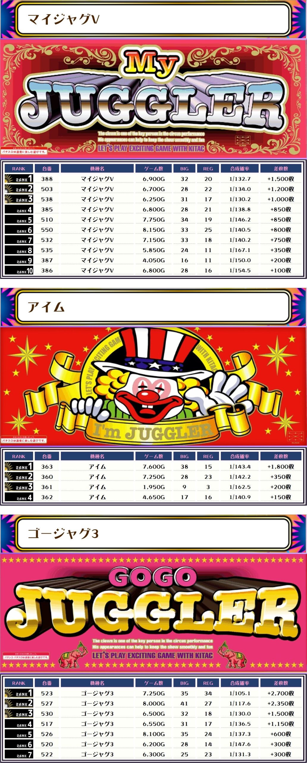 ジャグ系ではマイジャグV、ゴージャグ3、アイムの複数個所で並びと思われる個所を確認できました👀