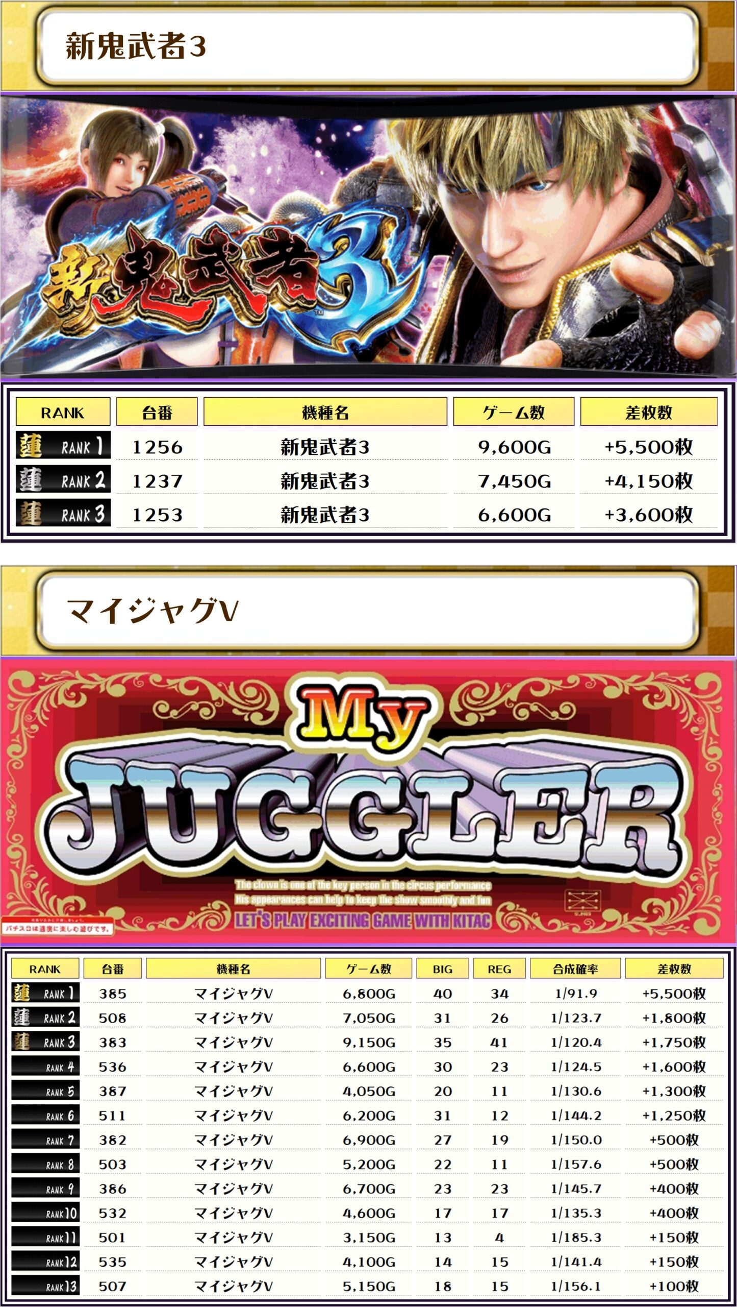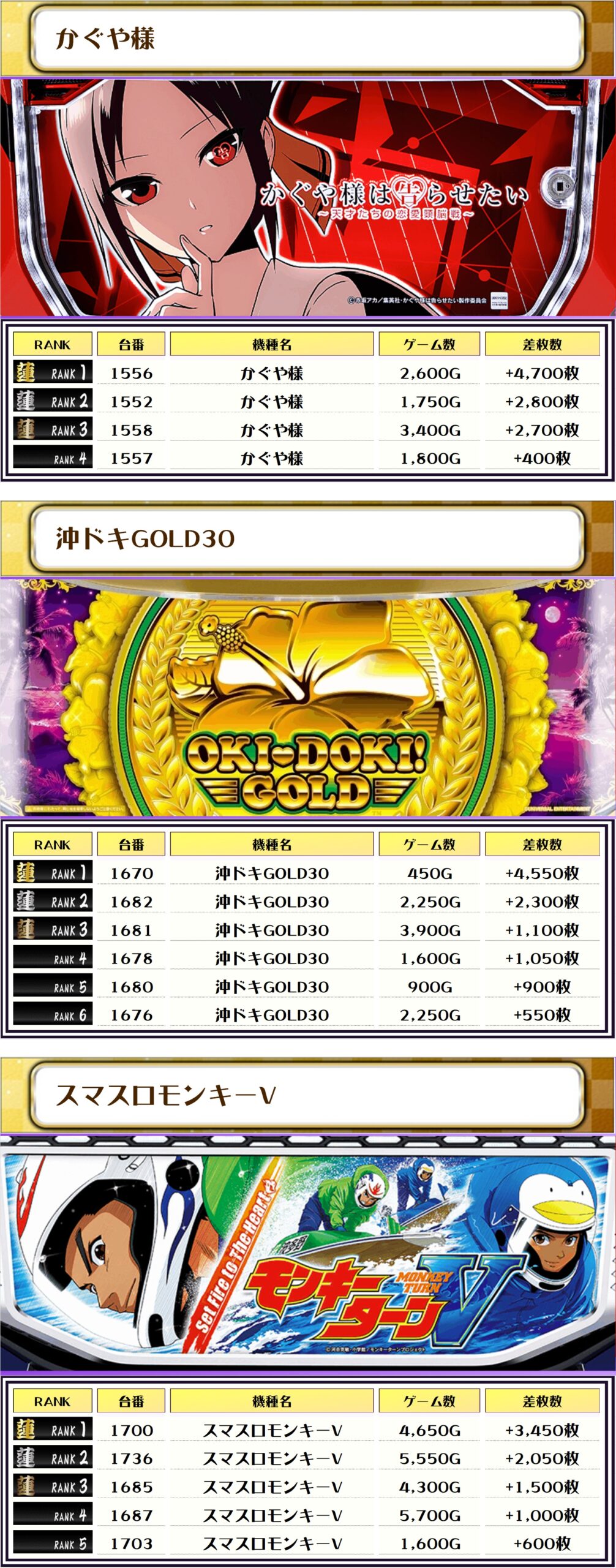 2位には【L咲・1623番台】の+7,400枚、3位には【マイジャグV・385番台】の+5,500枚がランクインっ🏆🏆🏆🏆