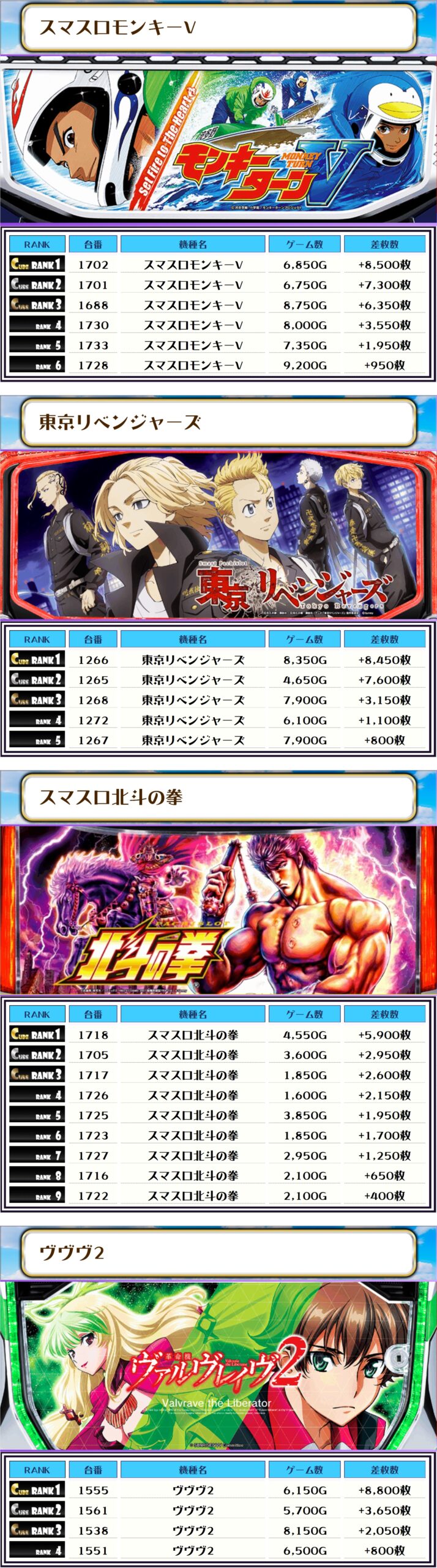 2位にも【新鬼武者3・1256番台】の+8,600枚、そして3位には【スマスロモンキーV・1702番台】の+8,500枚がランクインっ🏆🏆🏆🏆