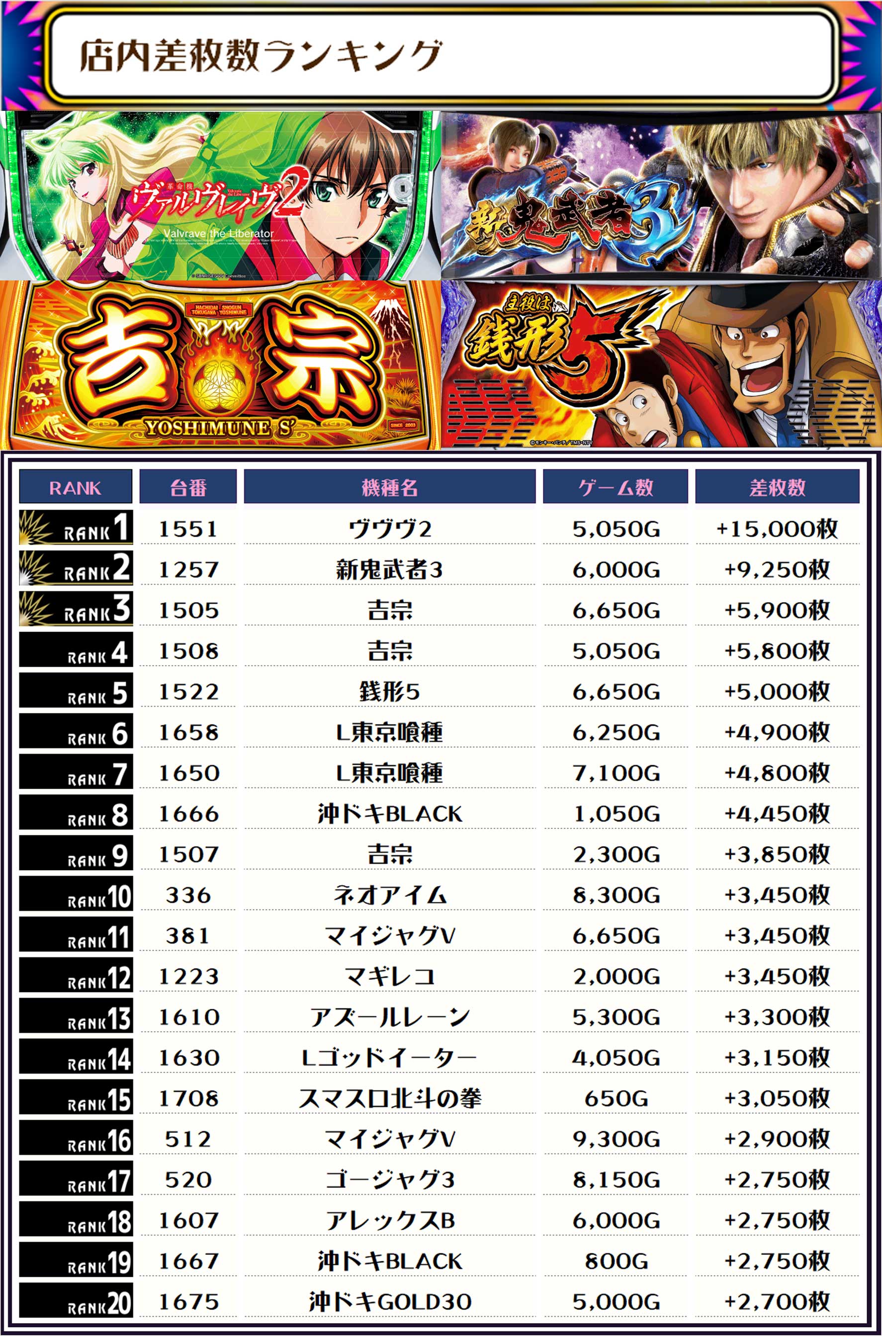 2位には【新鬼武者3・1257番台】の+9,250枚、そして3位には【吉宗・1505番台】の+5,900枚がランクインっ🏆🏆🏆🏆