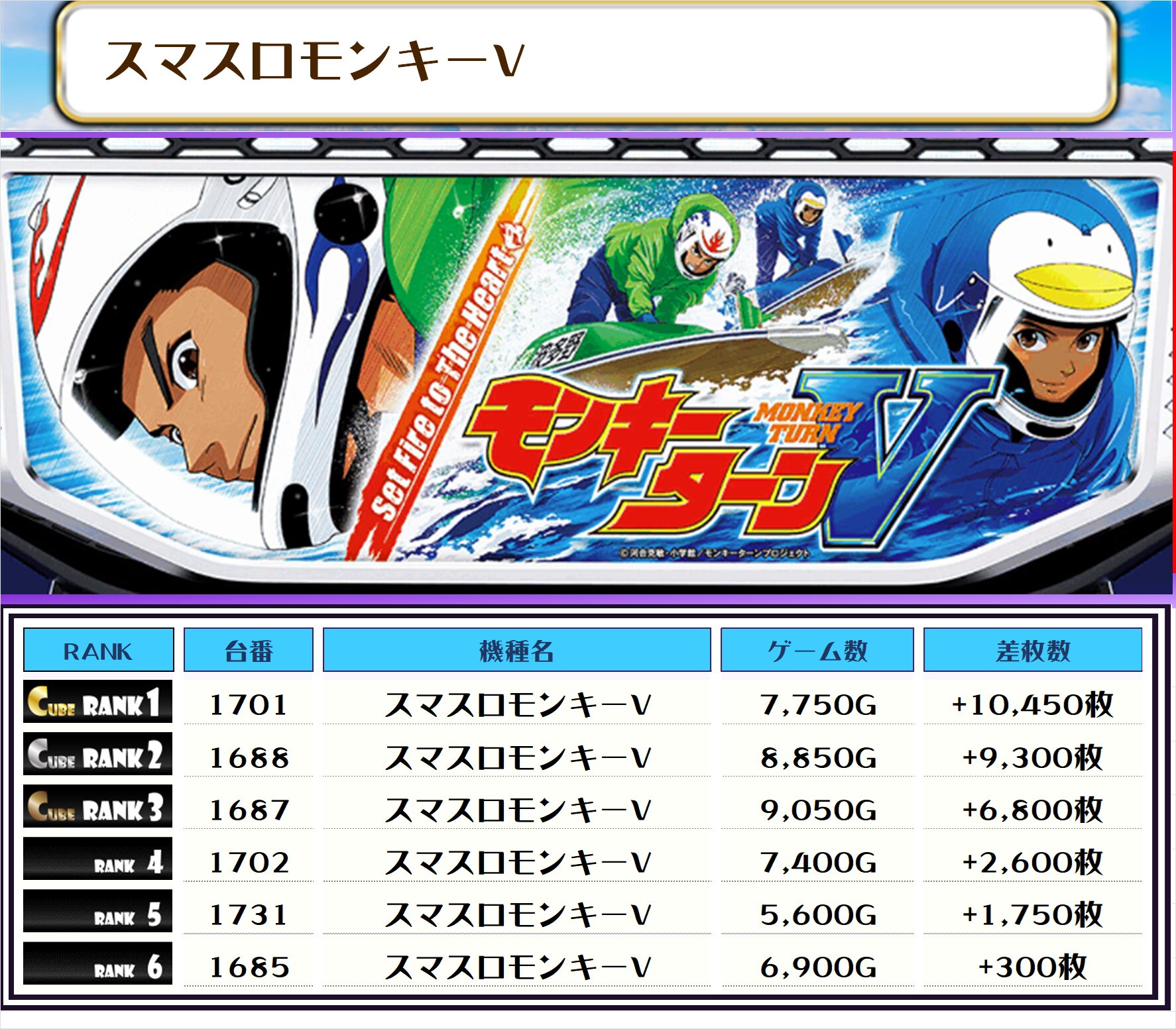 2位には【スマスロモンキーV・1701番台】の+10,450枚、3位には【ヴヴヴ2・1538番台】の+10,150枚がランクインっ🏆🏆🏆🏆