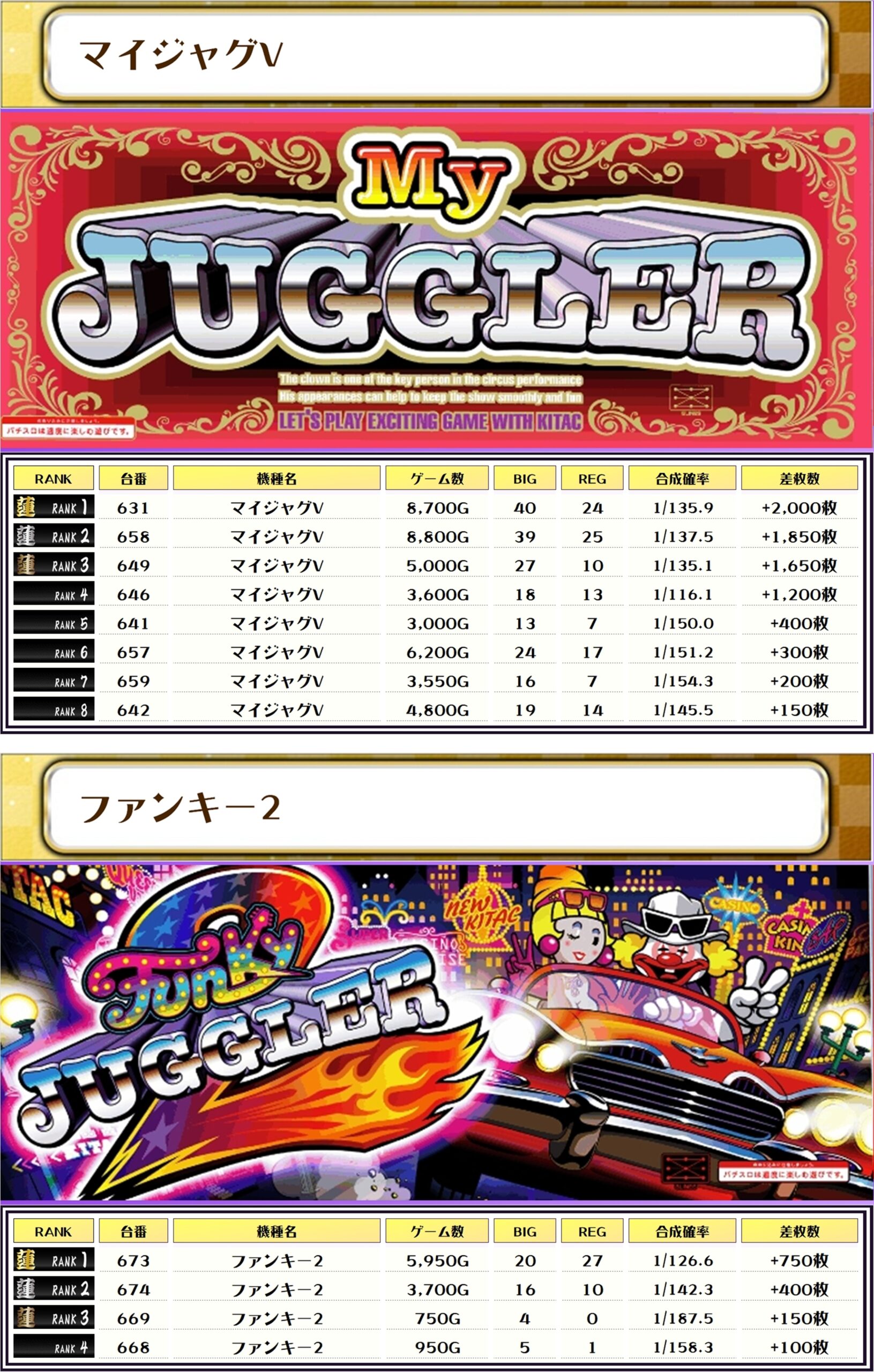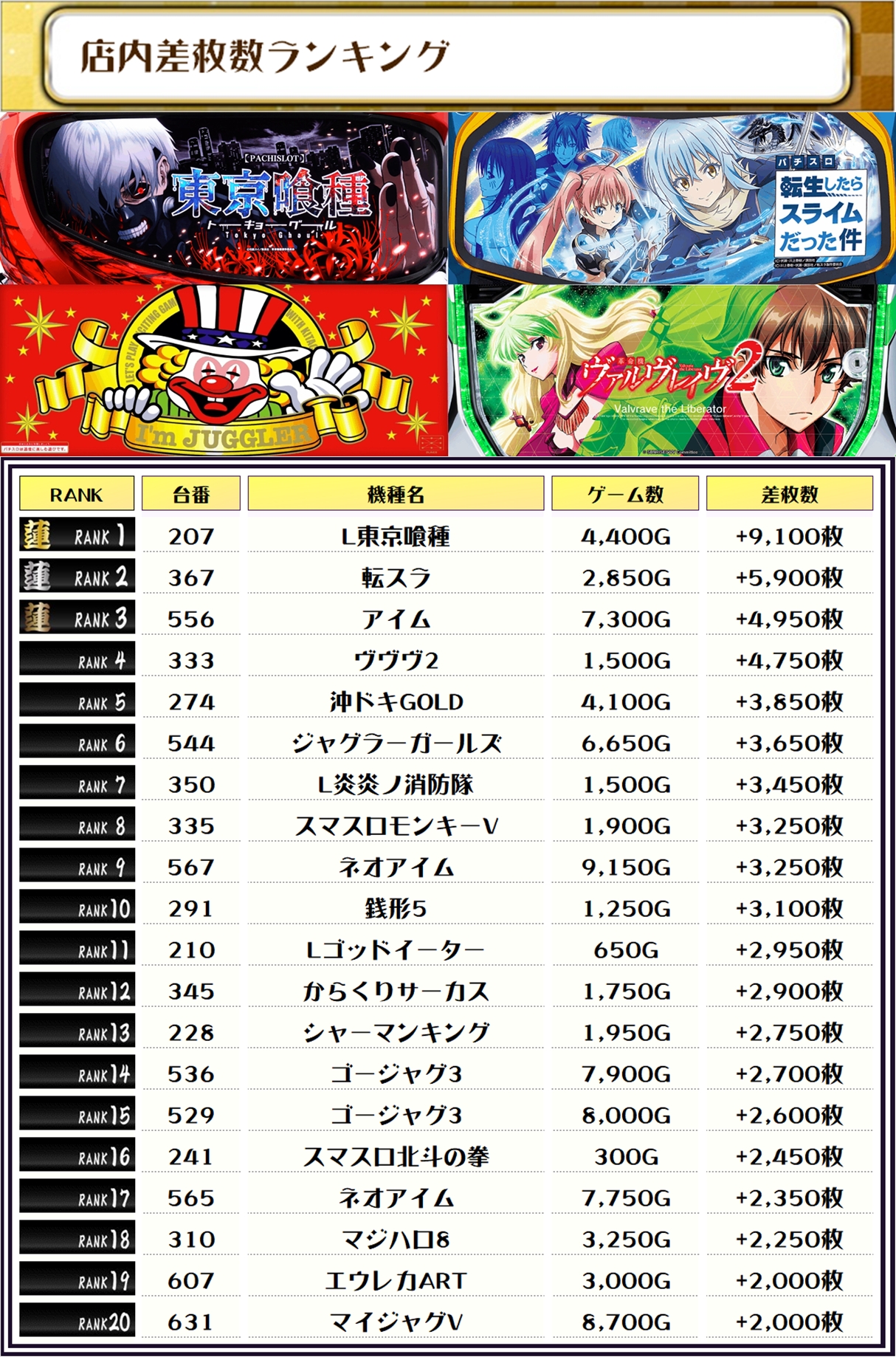 続いては【店内全台の差枚ランキング】をご覧ください!