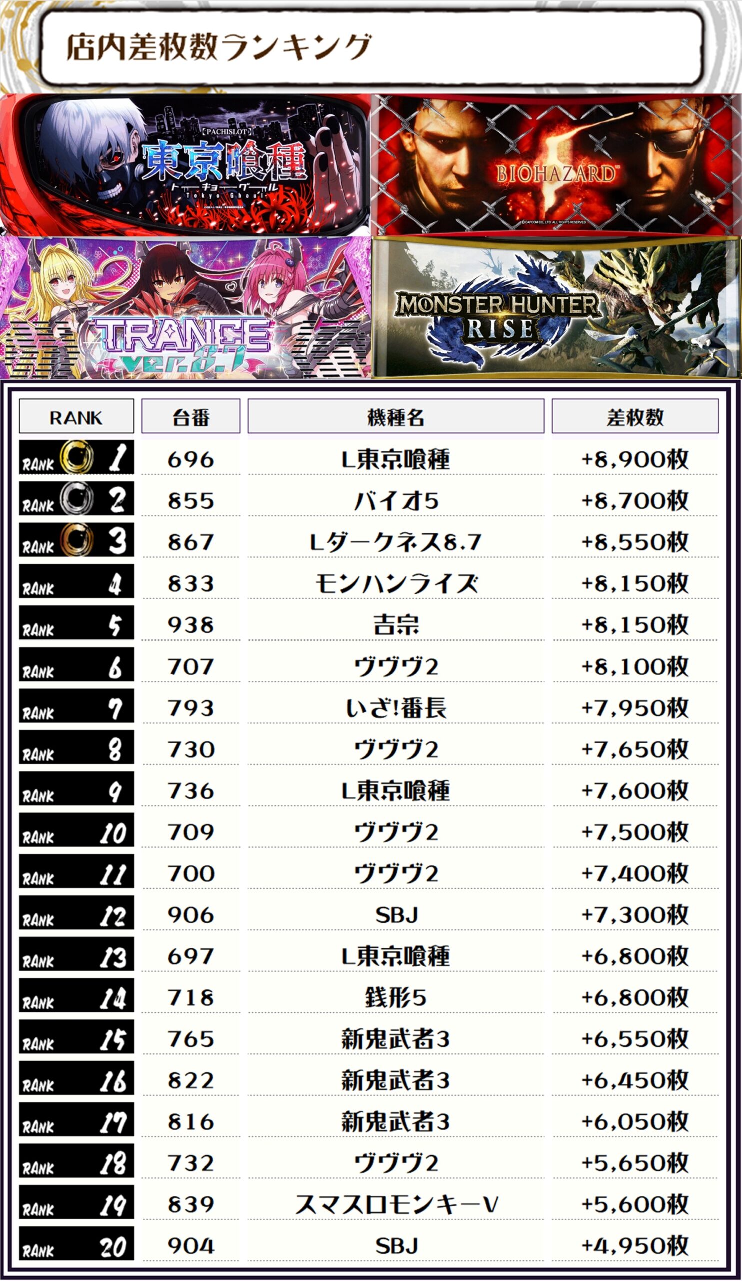 この日、全体の差枚トップに輝いたのは【L東京喰種・696番台】で+8,900枚‼️