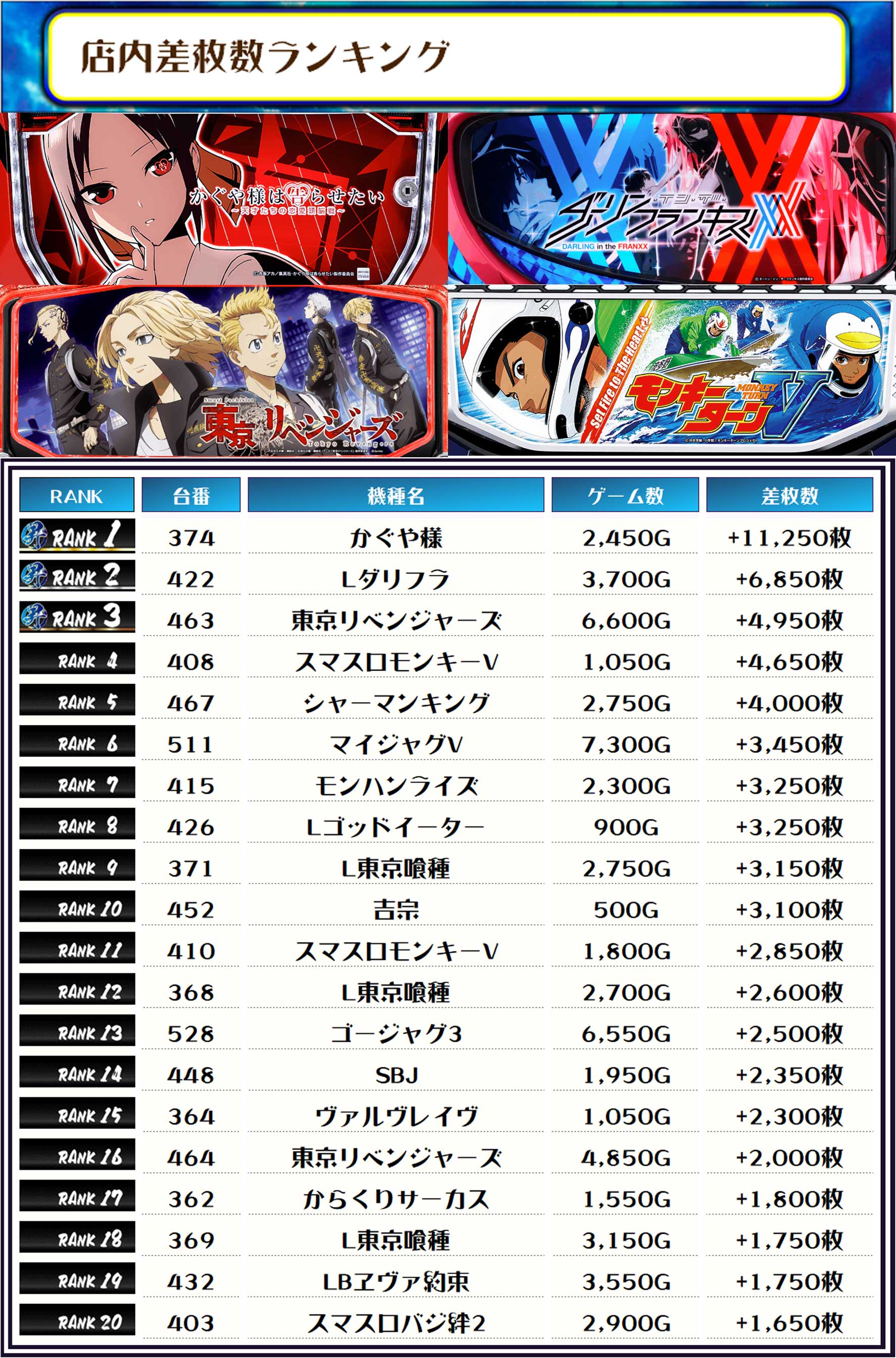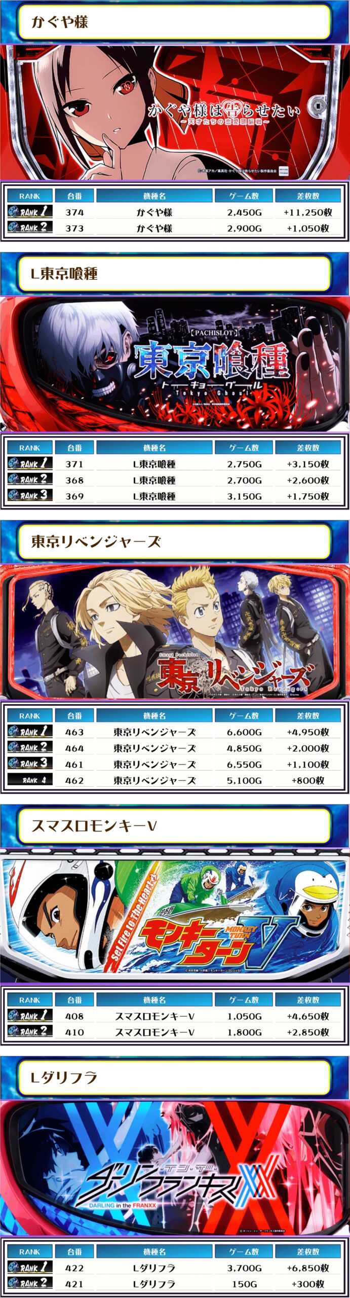全体のTOP差枚は【かぐや様・374番台】で+11,250枚を獲得っ❗️