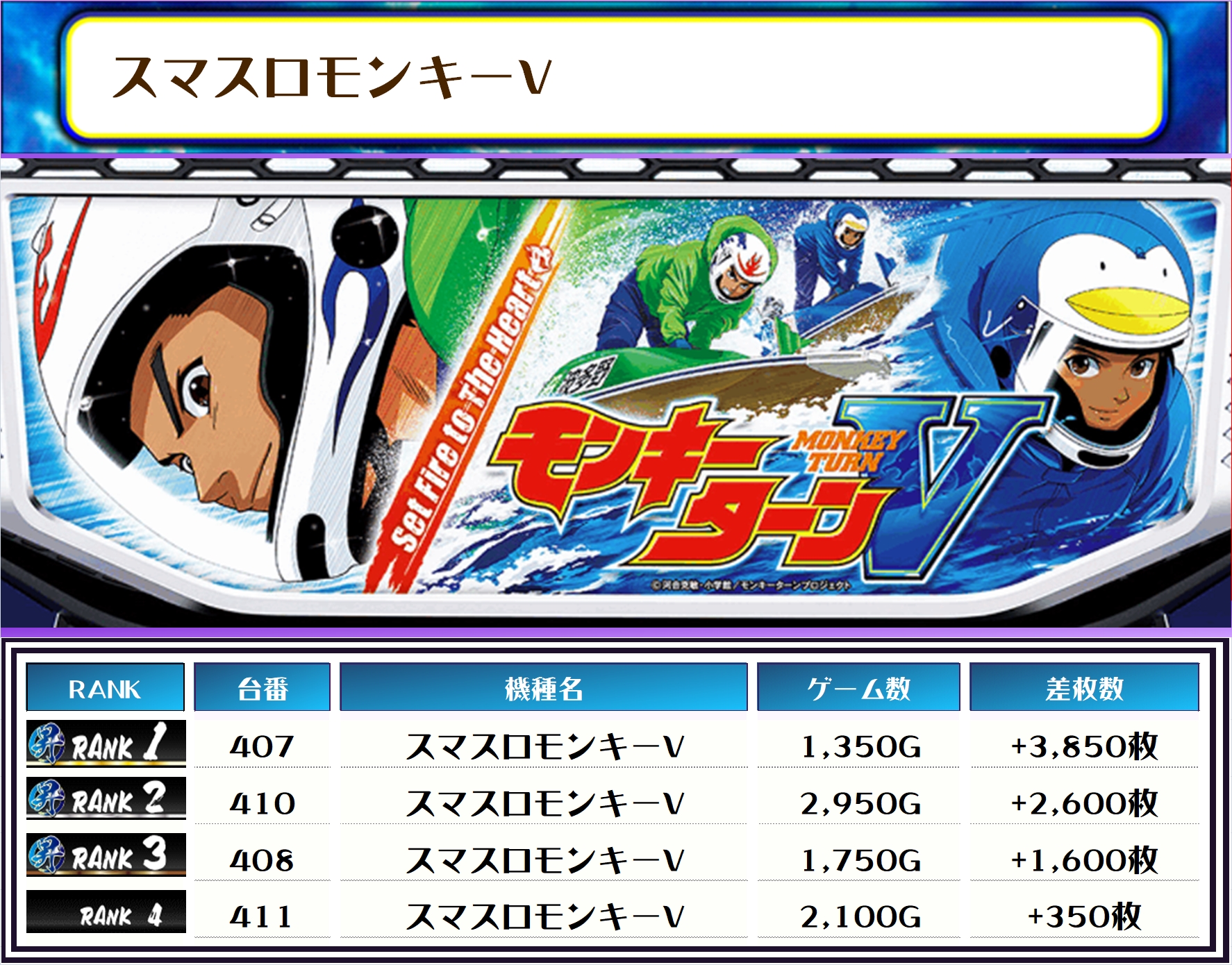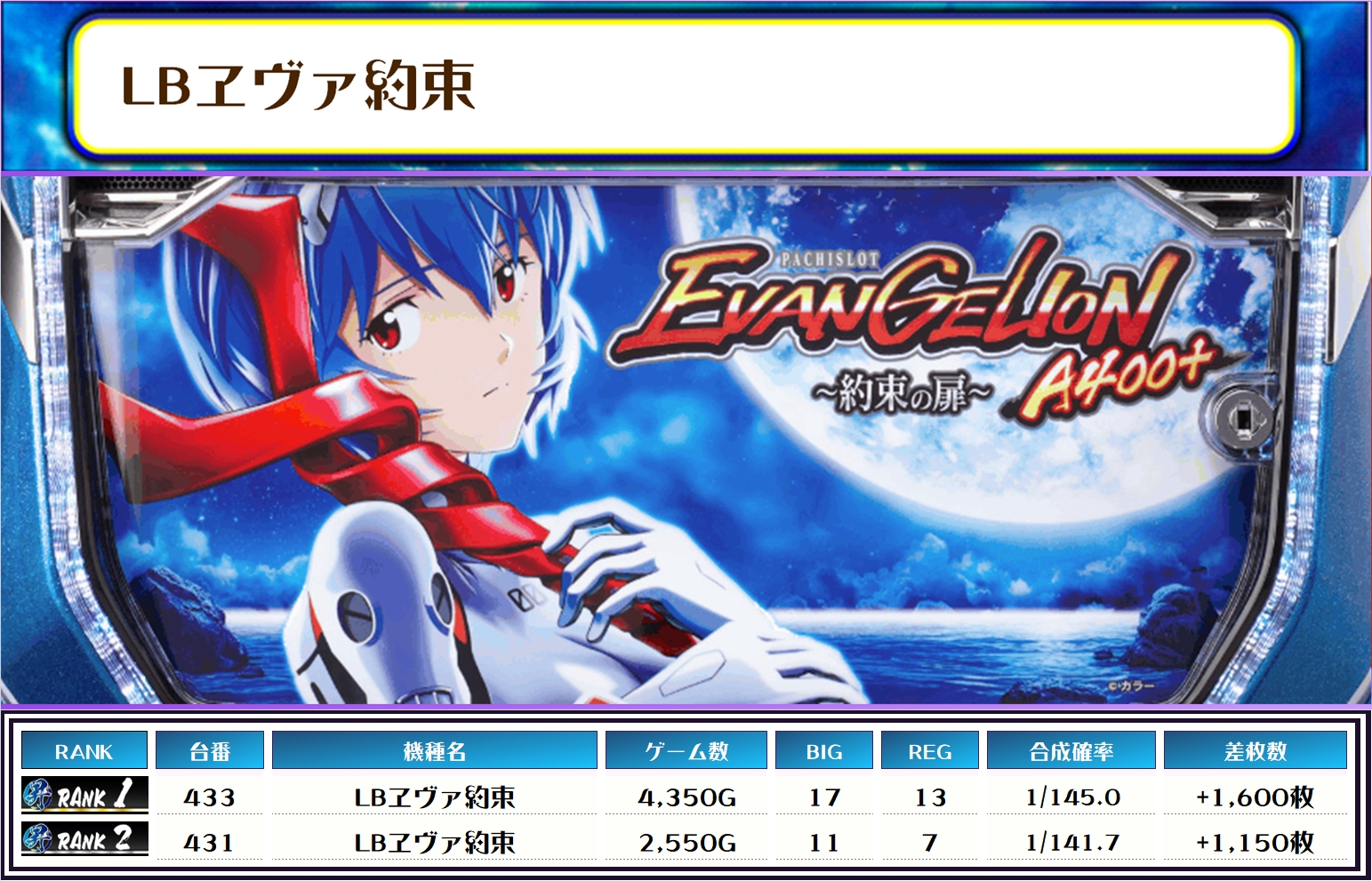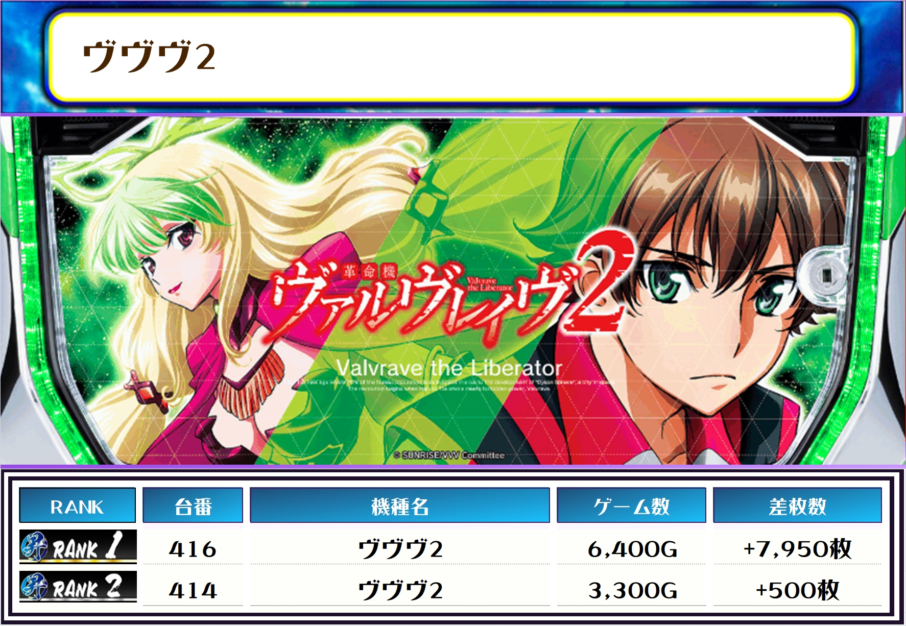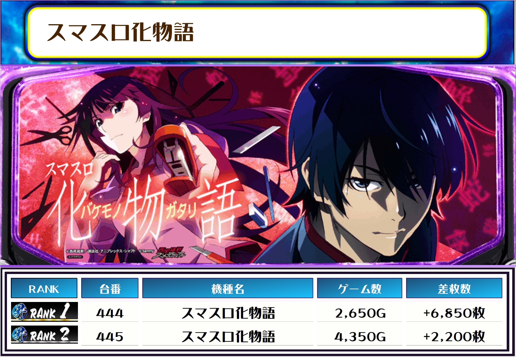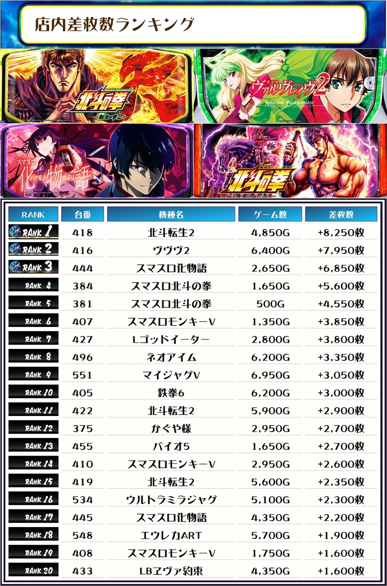 続く2位には【ヴヴヴ2・416番台】の+7,950枚、そして3位には【スマスロ化物語・444番台】の+6,850枚がランクインですっ❗️