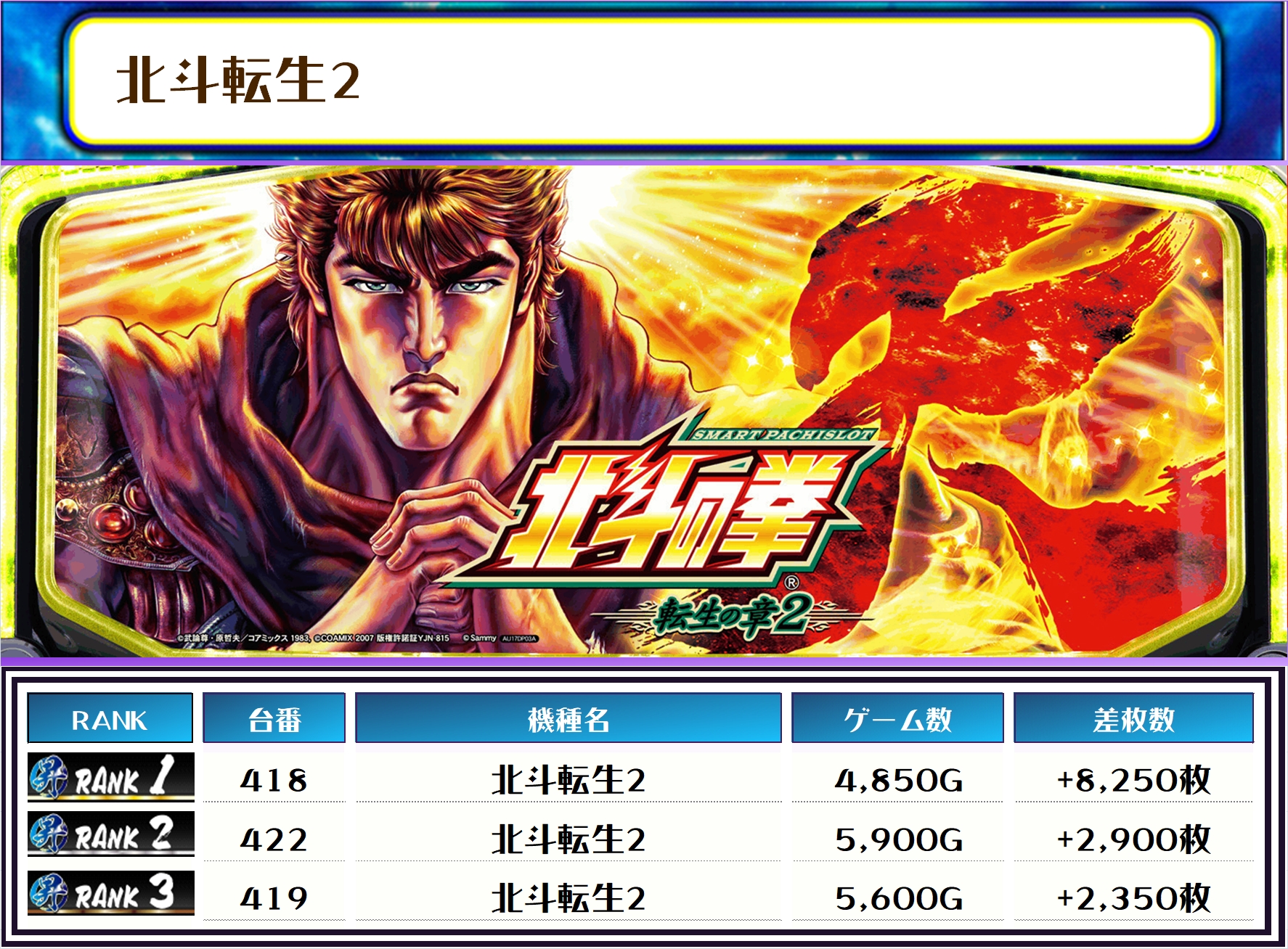 全体のTOP差枚は【北斗転生2・418番台】で+8,250枚を獲得っ❗️