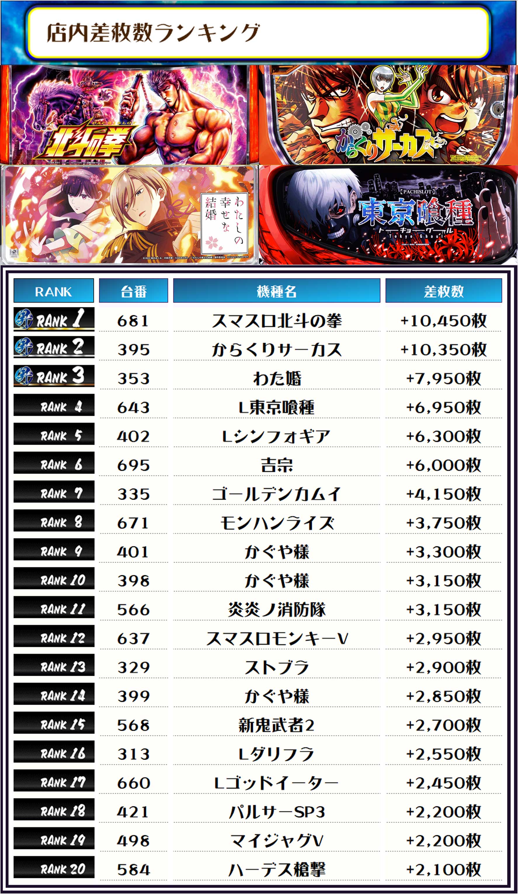 それでは、この日の【店内差枚ランキング】を見ていきましょう❗️