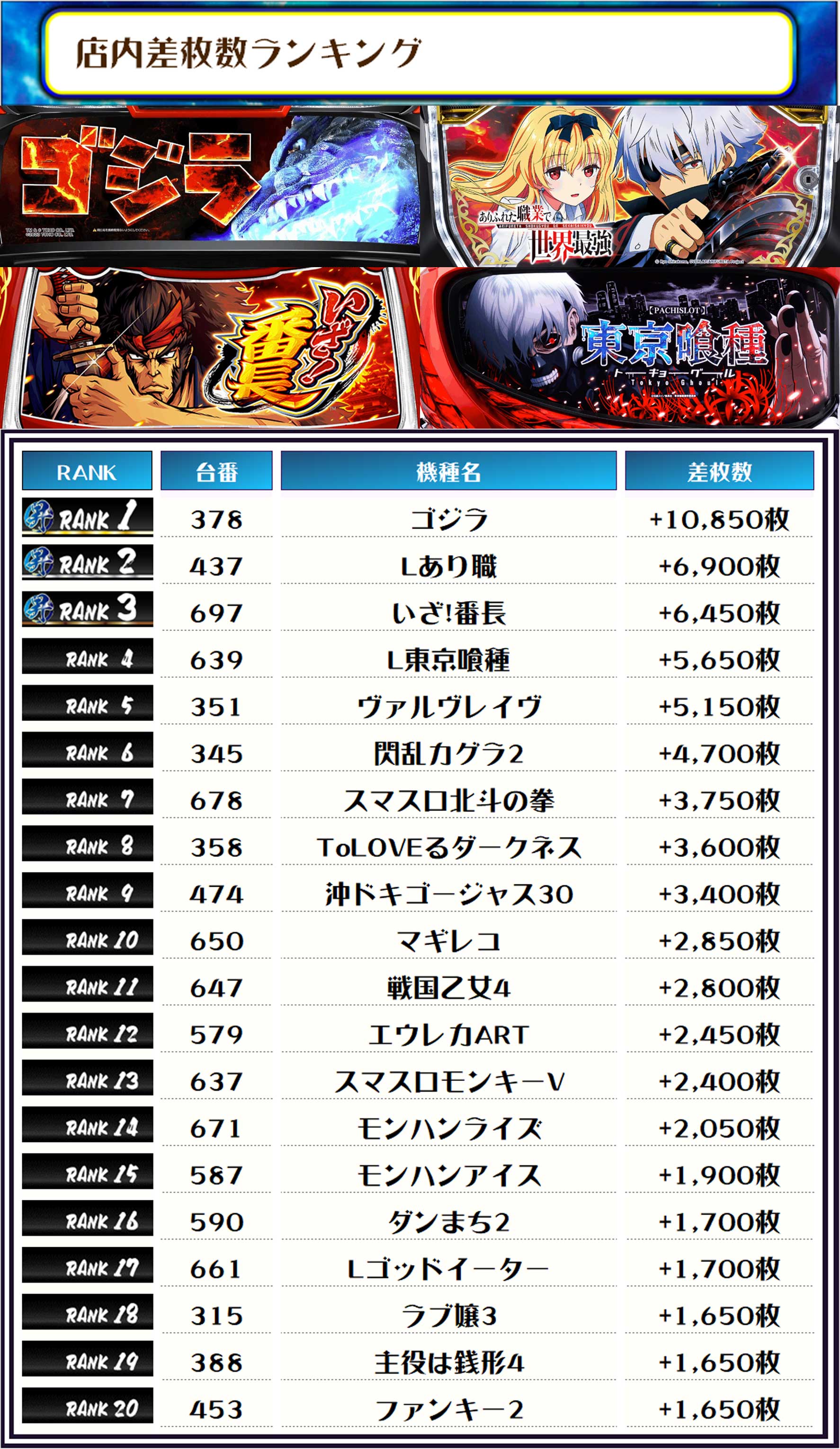 それでは、この日の【店内差枚ランキング】を見ていきましょう❗️