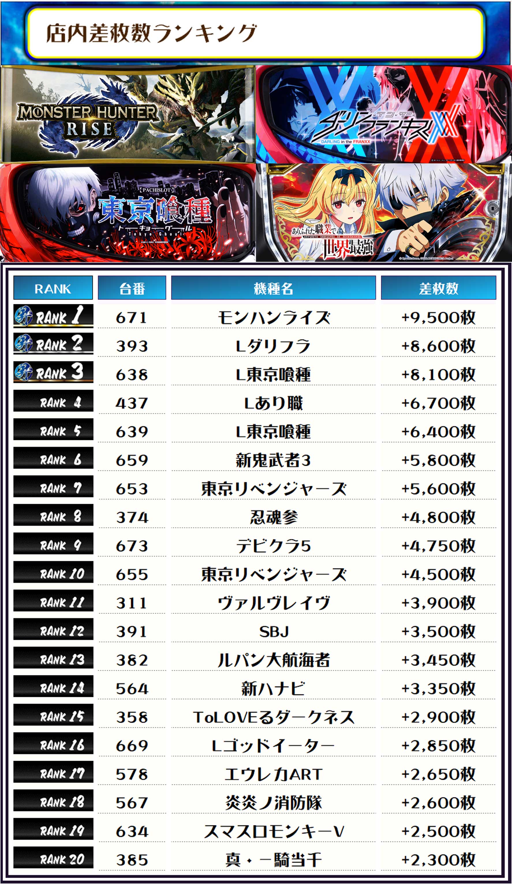 全体のTOP差枚は【モンハンライズ・671番台】で+9,500枚👍
