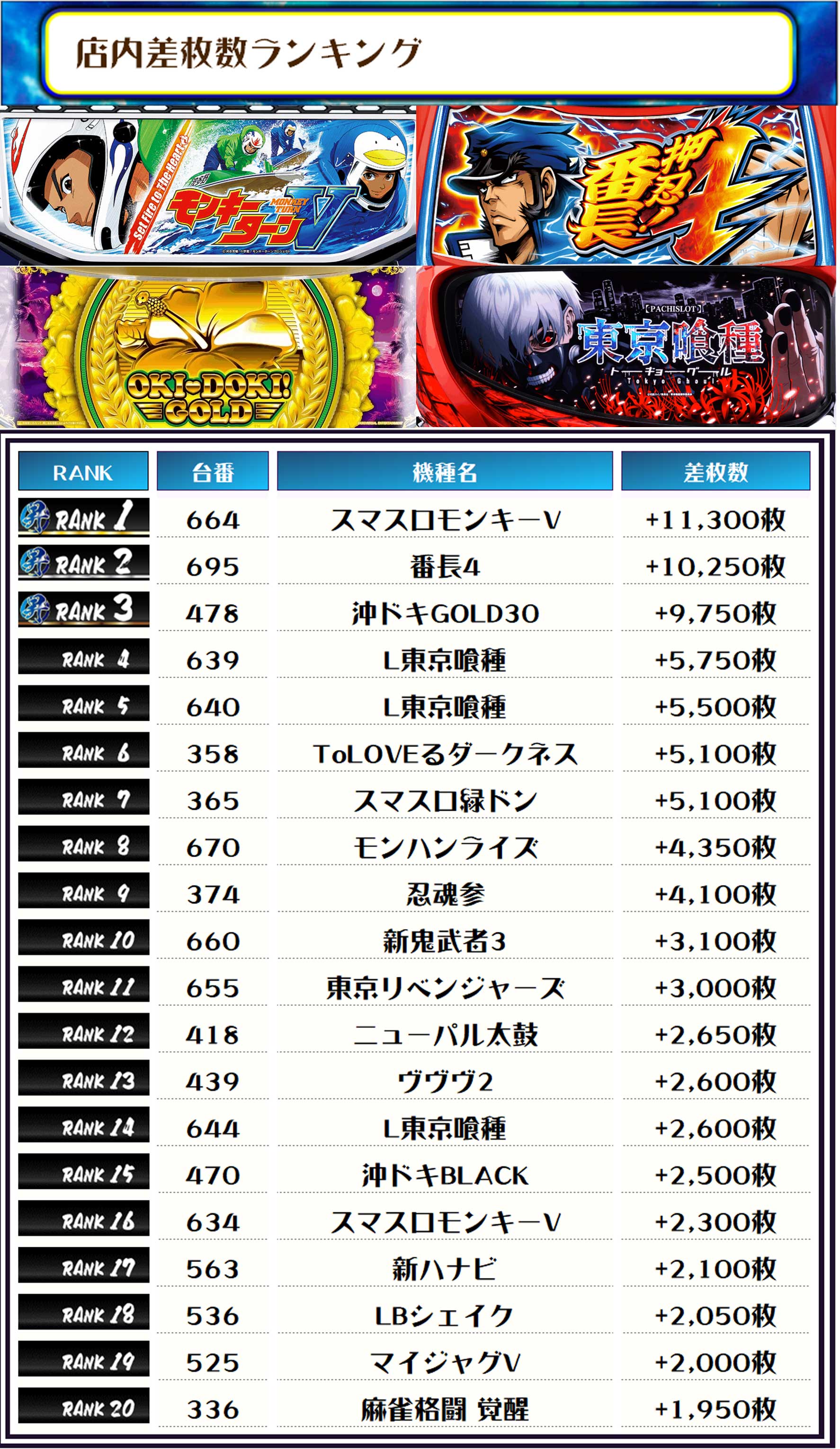 それでは、この日の【店内差枚ランキング】を見ていきましょう❗️
