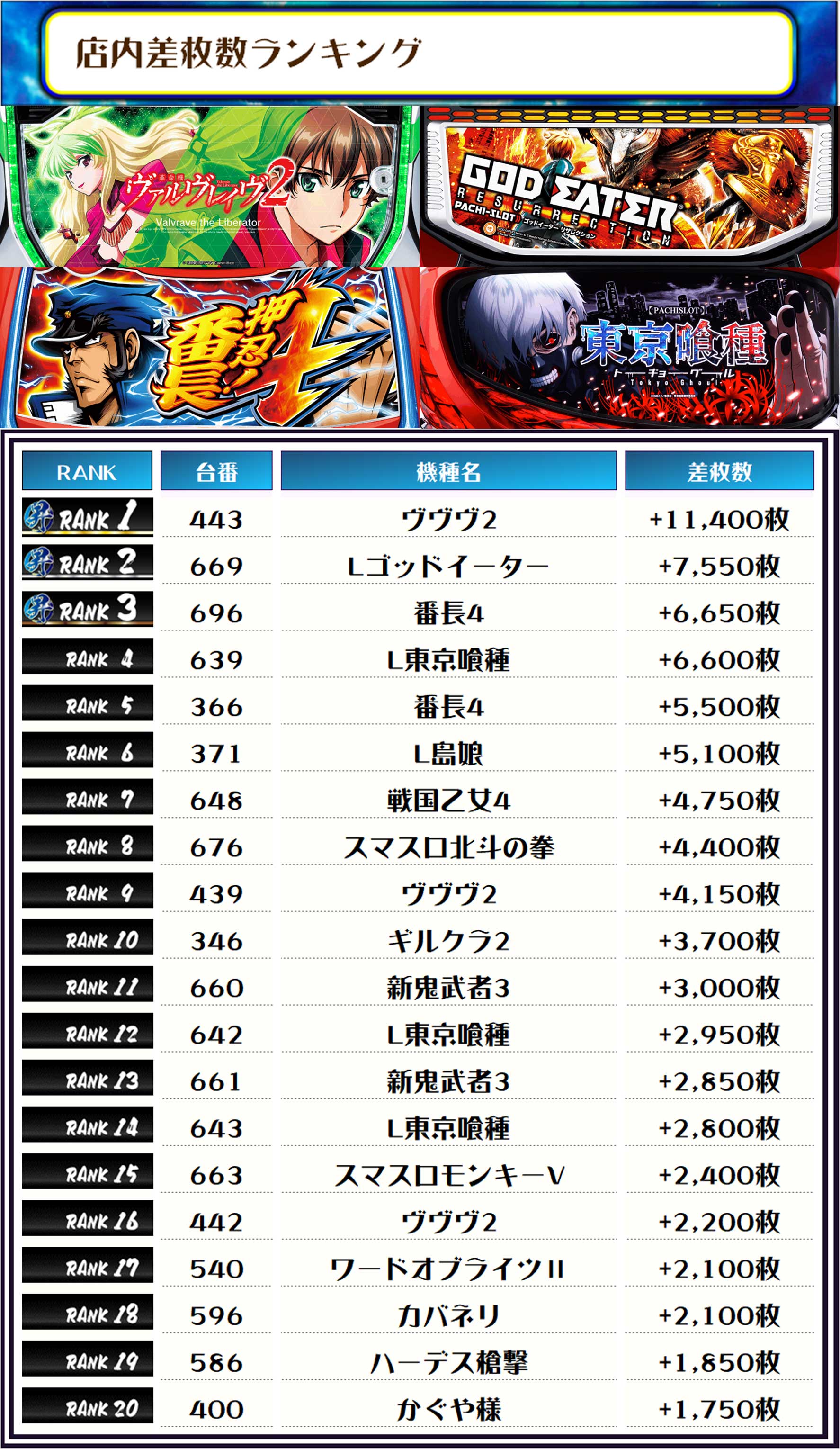 それでは、この日の【店内差枚ランキング】を見ていきましょう❗️