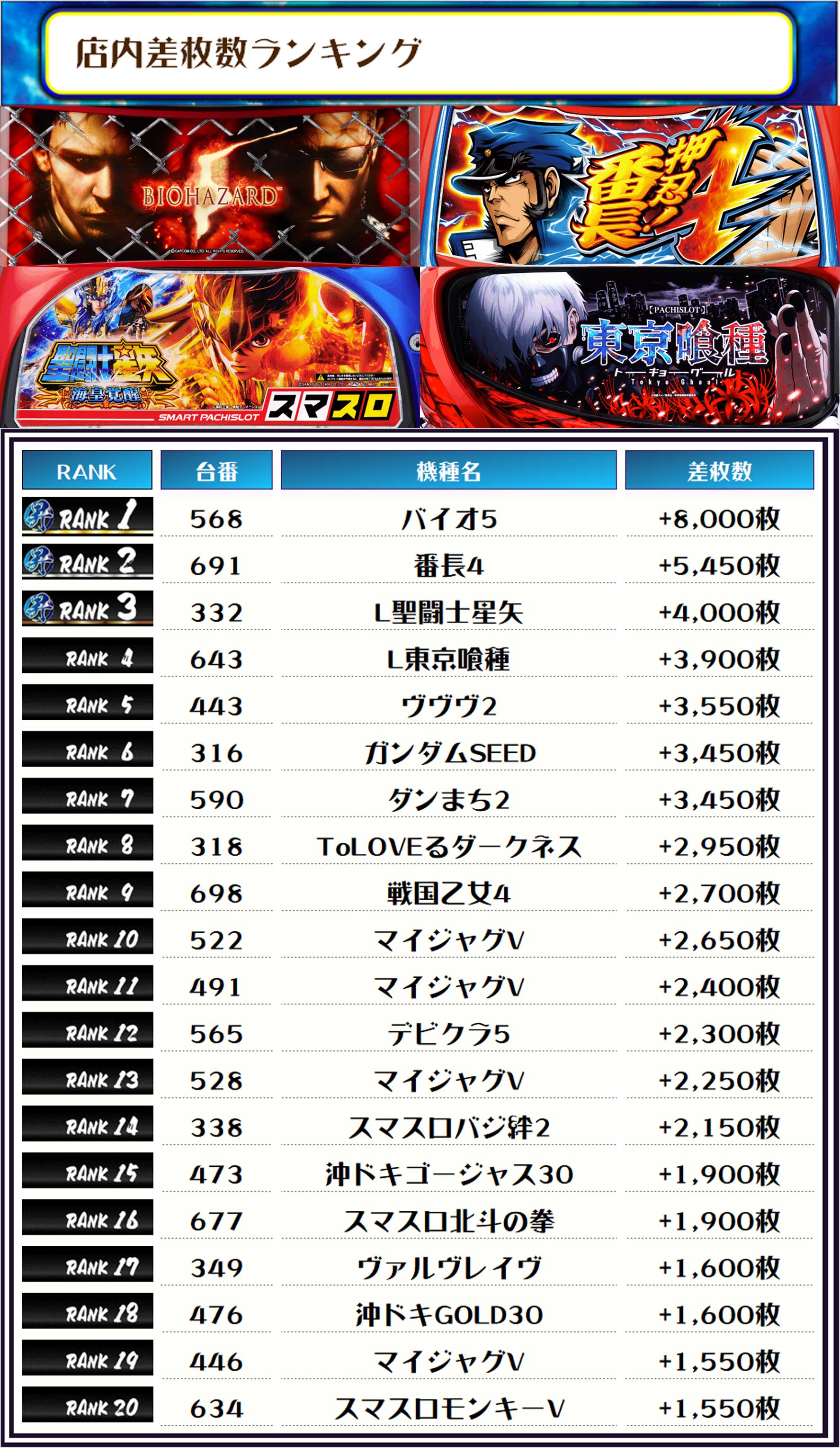 それでは、この日の【店内差枚ランキング】を見ていきましょう❗️