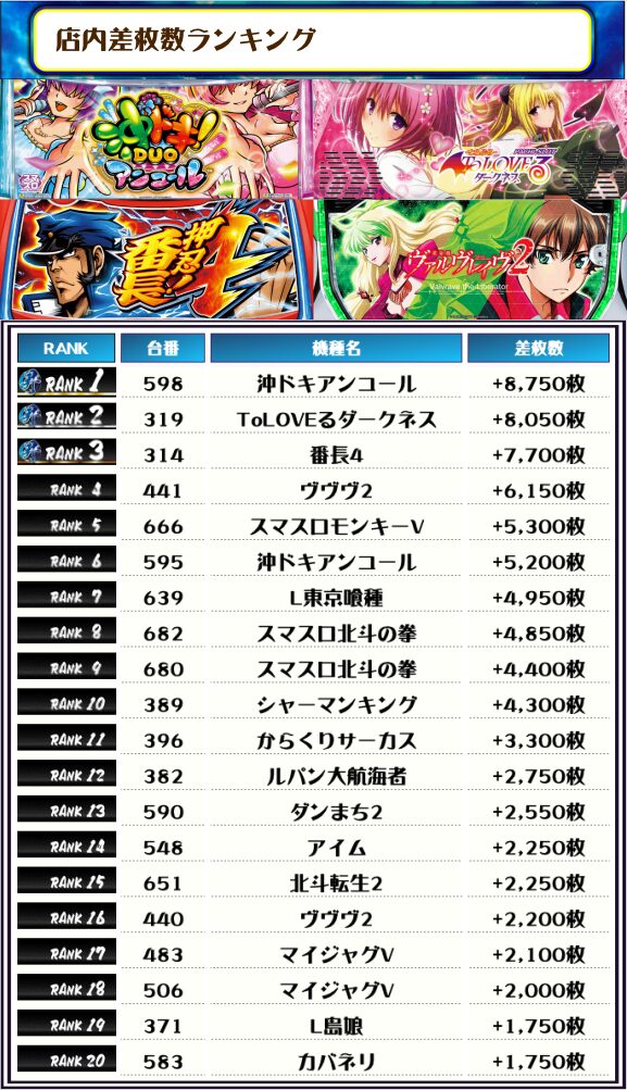 続く2位には【ToLOVEるダークネス・319番台】の+8,050枚、そして3位には【番長4・314番台】の+7,700枚がランクインですっ❗️