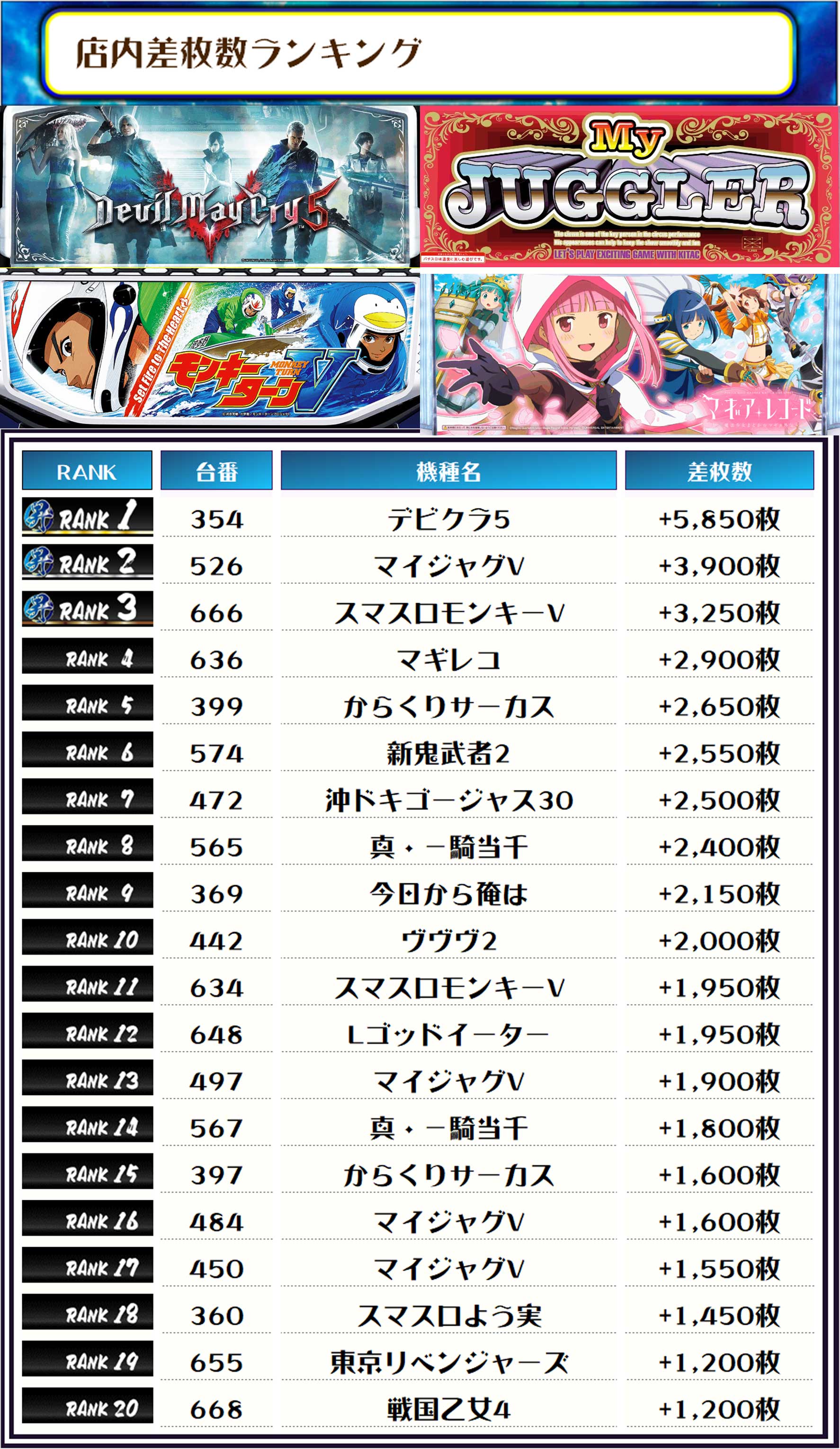 続く2位には【マイジャグV・526番台】の+3,900枚、そして3位には【スマスロモンキーV・666番台】の+3,250枚がランクインですっ❗️