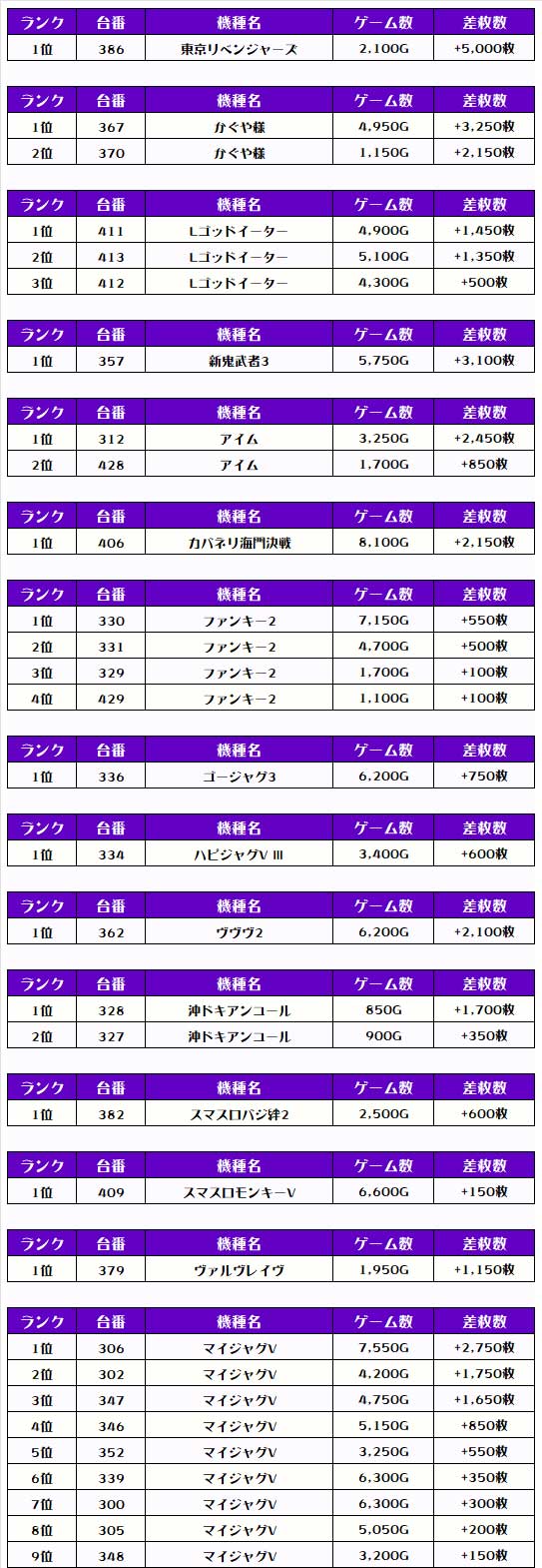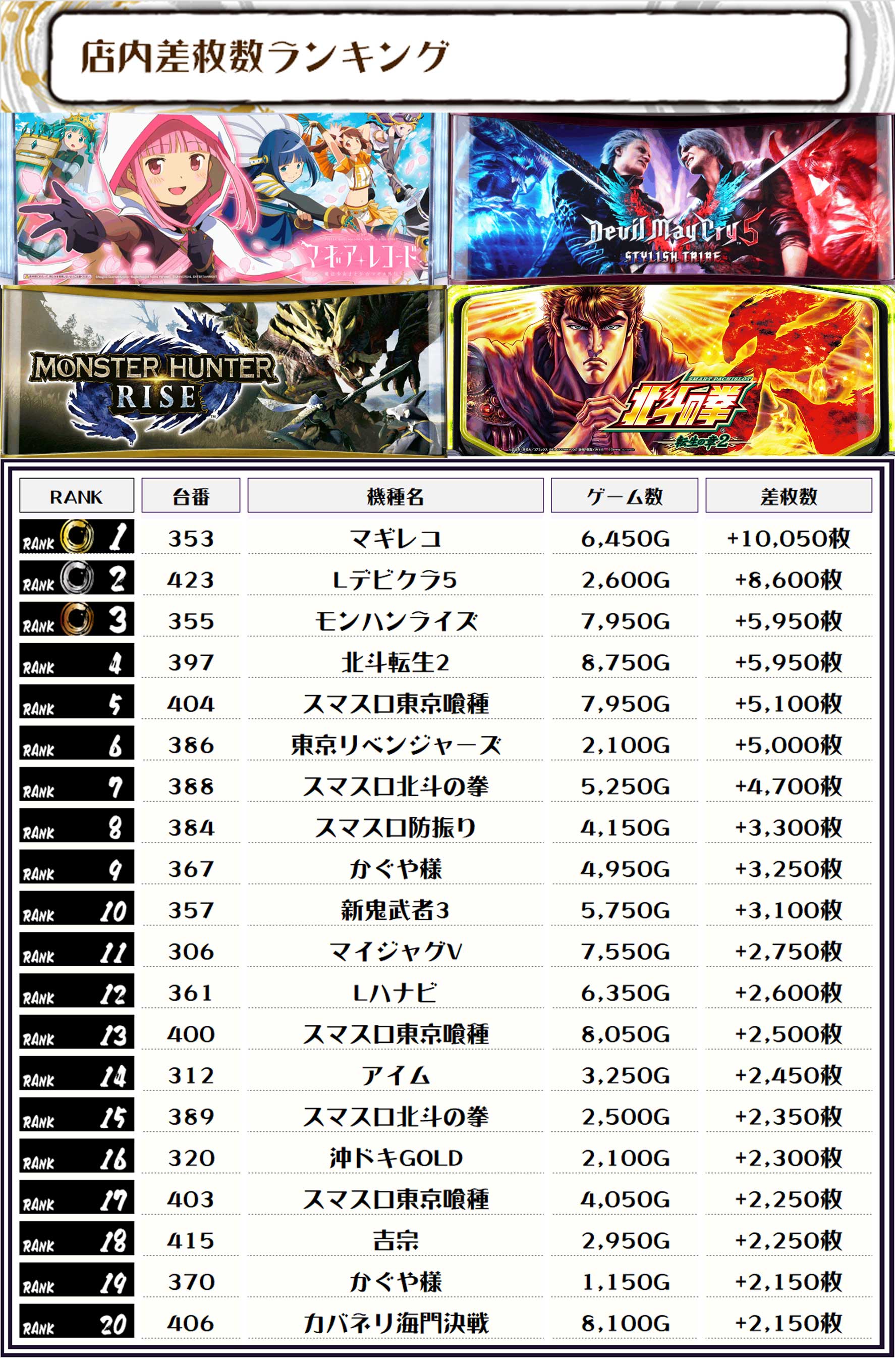 全体のTOP差枚は【マギレコ・353番台】で+10,050枚🎉
