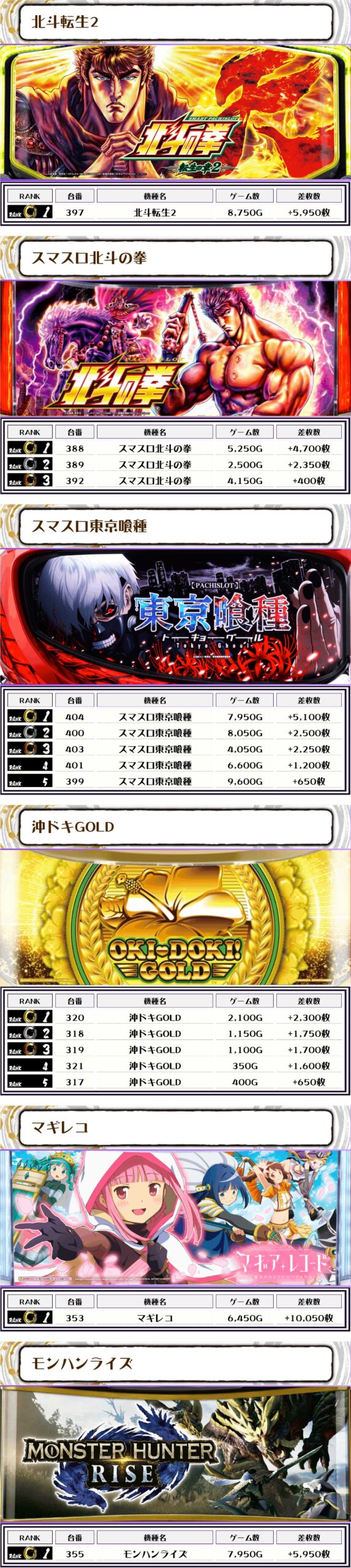 2位には【Lデビクラ5・423番台】の+8,600枚、そして3位には【モンハンライズ・355番台】の+5,950枚がランクインしましたっ🌟🌟🌟