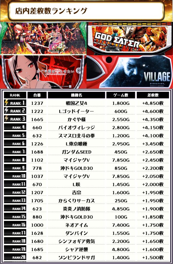 続いては【店内全台の差枚ランキング】をご覧ください!