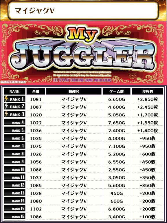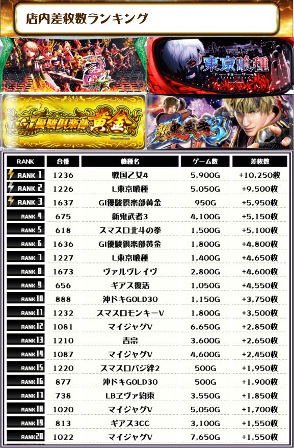 続いては【店内全台の差枚ランキング】をご覧ください!